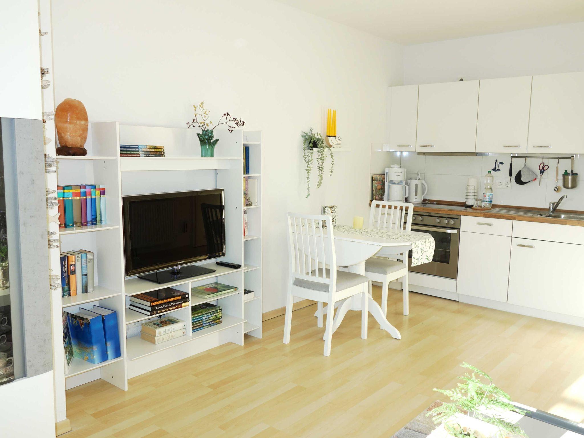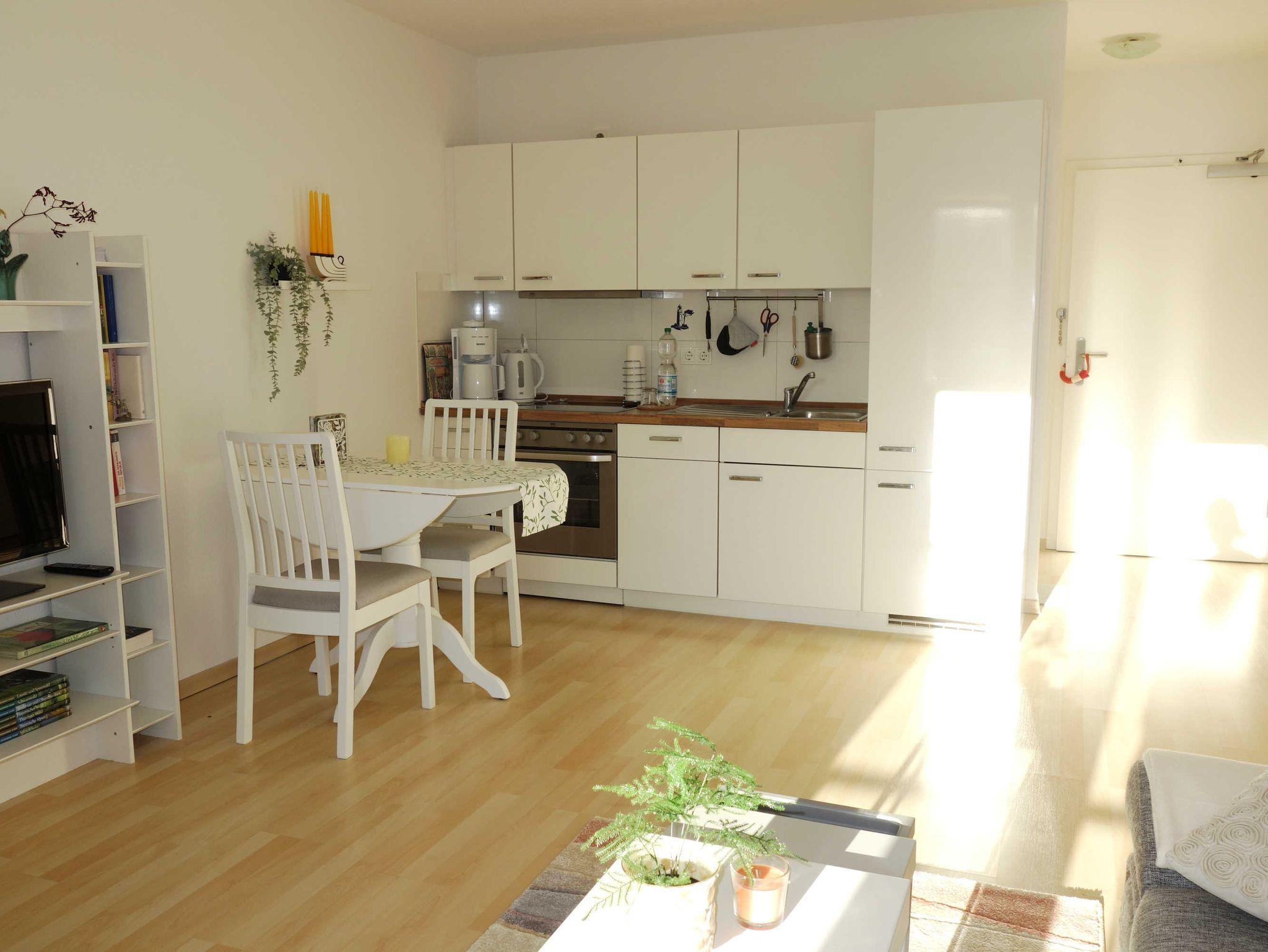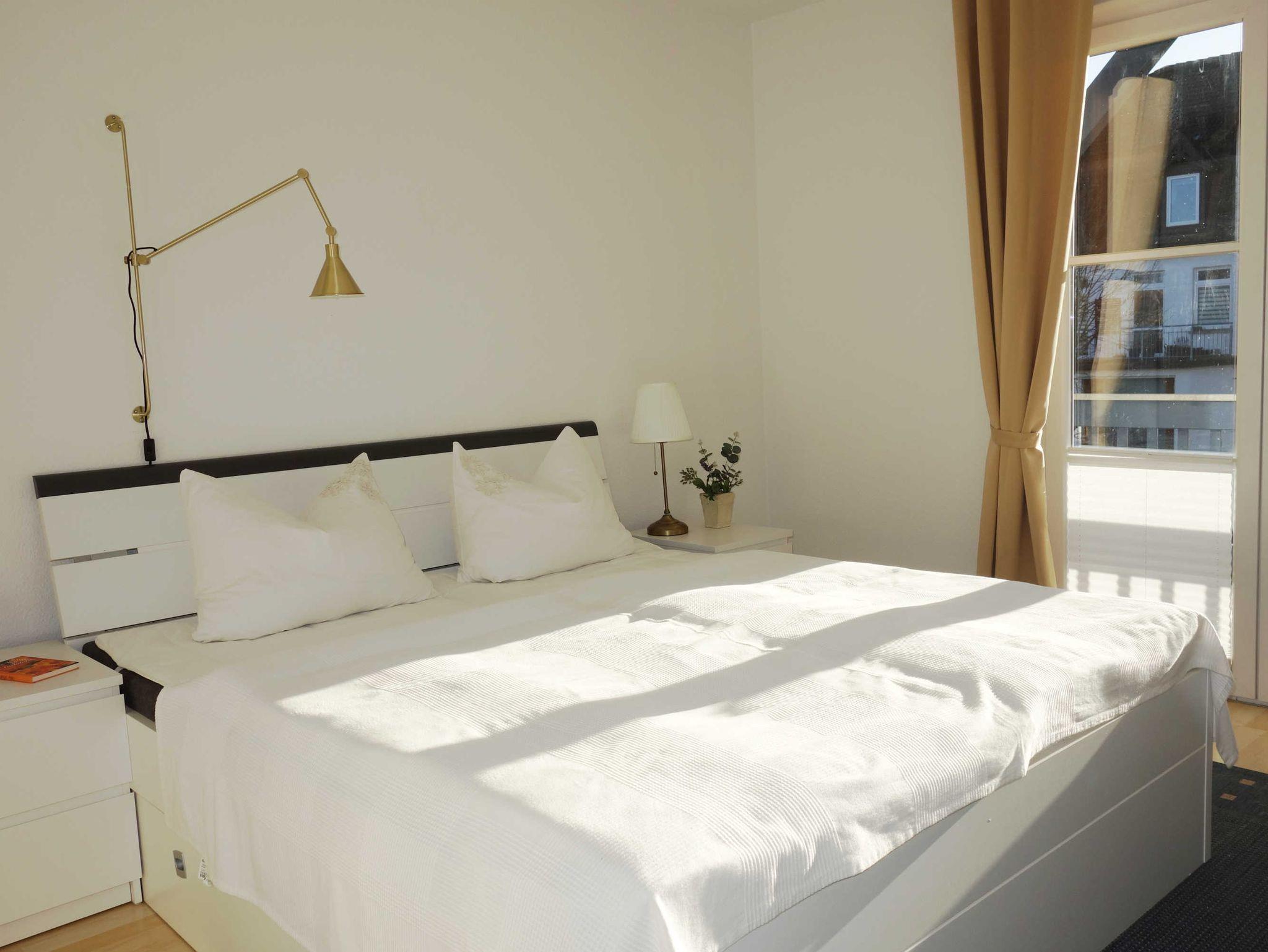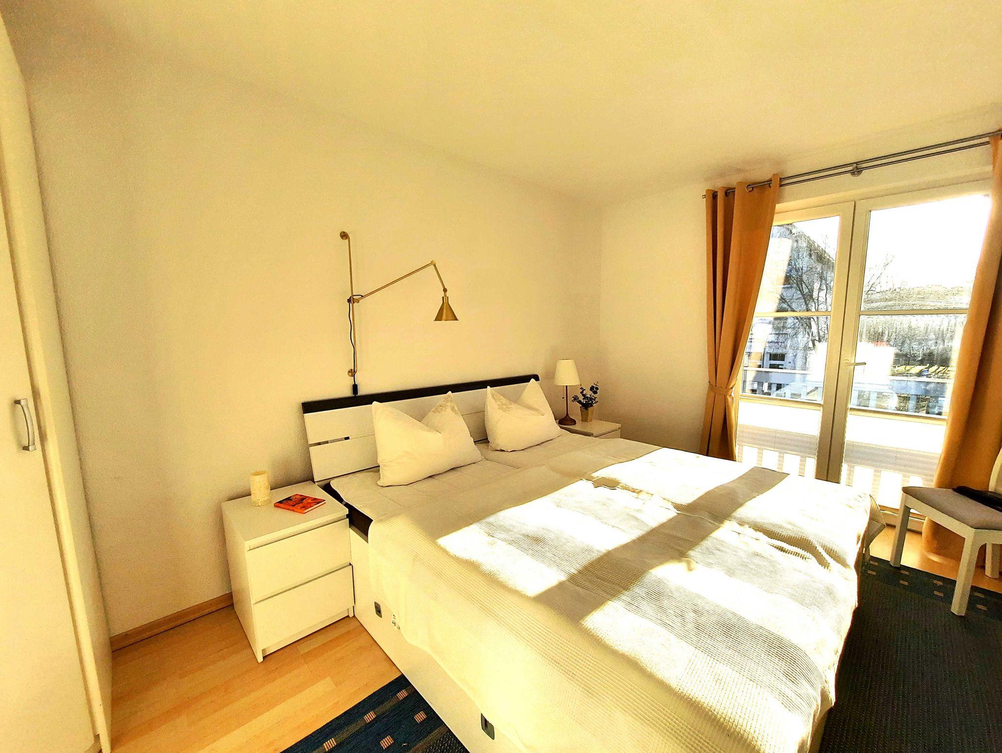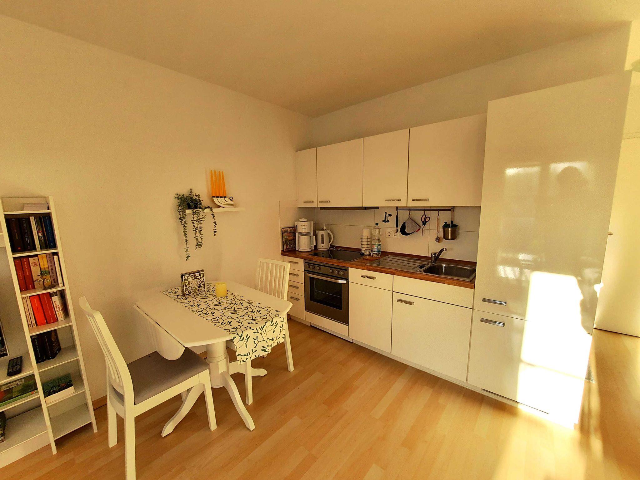 Bei der Ferienwohnung Kleine Auszeit ist der Name Programm. Im geräumigen Wohnzimmer können Sie auf der gemütlichen Couch beim Fernsehen oder Lesen (kleine Auswahl an Büchern ist vorhanden) entspannen oder in der offenen, angrenzenden Küche mit Wasserkocher, Ceran-Kochfeld und Backofen sowie einer Kaffeemaschine ein schmackhaftes Essen zubereiten. Im Schlafzimmer finden Sie ein Doppelbett, einen Kleiderschrank und einen weiteren Fernseher. Das Highlight dieser Ferienwohnung ist der 10 Meter lange Balkon mit Blick auf die Kurstraße. Der beeindruckende Balkon ist nach Westen ausgerichtet und wartet auf Sie mit einer Sonnenliege, einem Tisch, 2 Stühlen und einem Sonnenschirm. Im Bad befinden sich eine Dusche, ein WC, eine Waschmaschine sowie eine Handtuch-Heizung. Zur Wohnung gehören außerdem ein Fahrradkeller und ein PKW-Stellplatz.