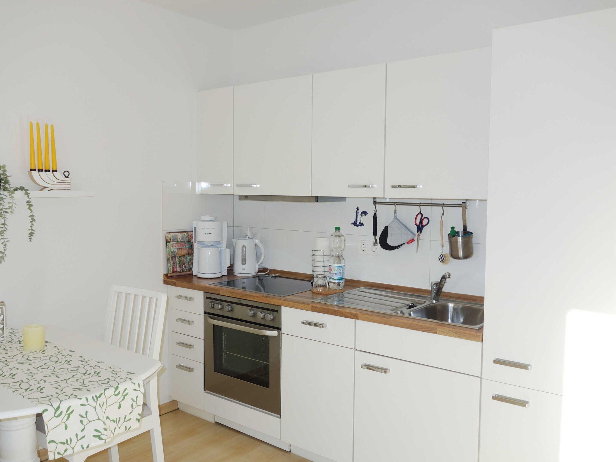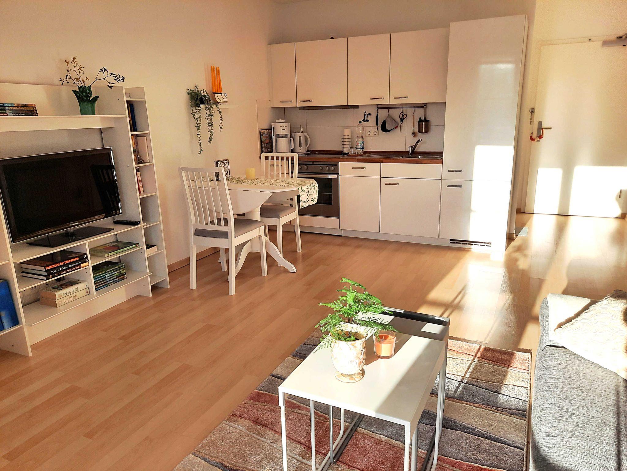 In der Ferienwohnung gibt es ein Wohnzimmer mit Fernseher und Couch, eine offene Küche mit Backofen, Geschirrspüler und Kühlschrank, ein Bad mit Dusche, WC und Waschtisch sowie ein Schlafzimmer mit Doppelbett und Kleiderschrank.