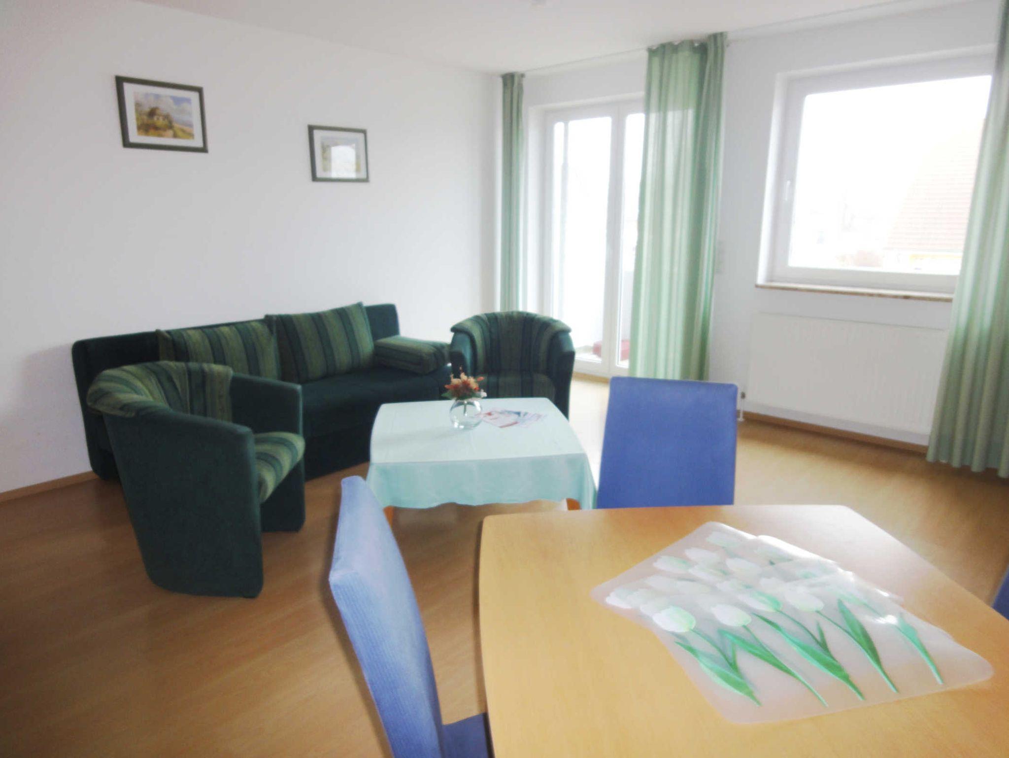 Der Wohn- und Schlafbereich ist mit einer Schlafcouch für 2 Personen ausgestattet und verfügt über eine kleine Stereo Anlage mit CD-Player sowie einen Flachbildfernseher. Zu dem Appartement gehört ein Balkon mit Richtung gen Süden.