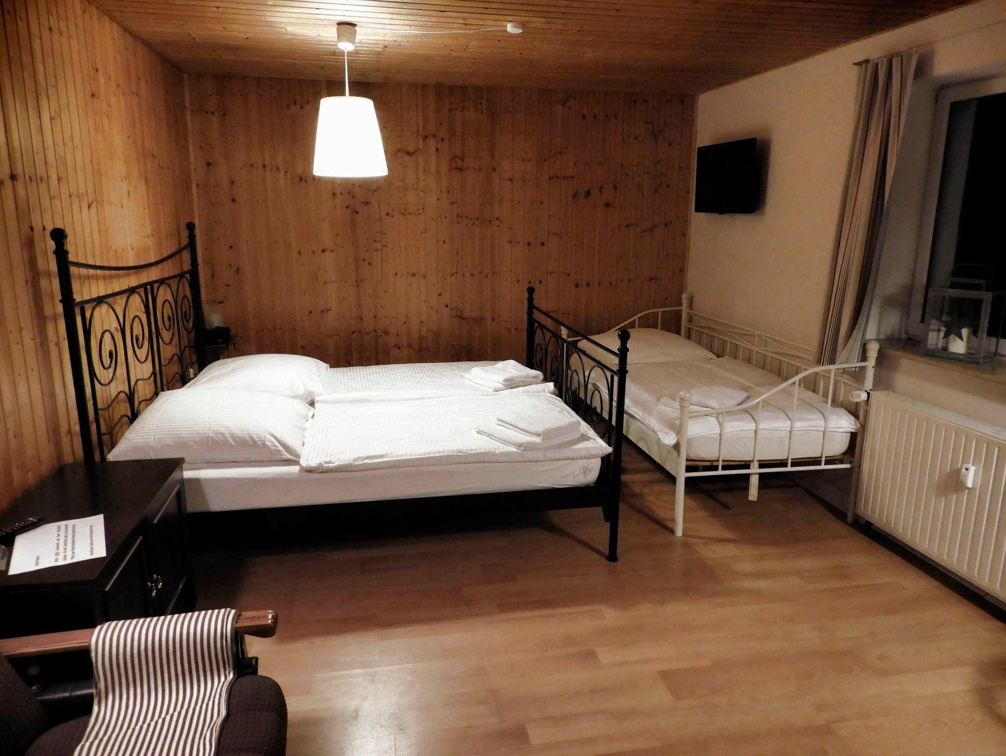 Das Ferienzimmer Kräuterhexe in Graal-Müritz bietet Ihnen ein Doppelbett und ein Einzelbett, ein LCD-TV mit Satellitenempfang sowie einen Schrank und einen Tisch mit drei Stühlen.