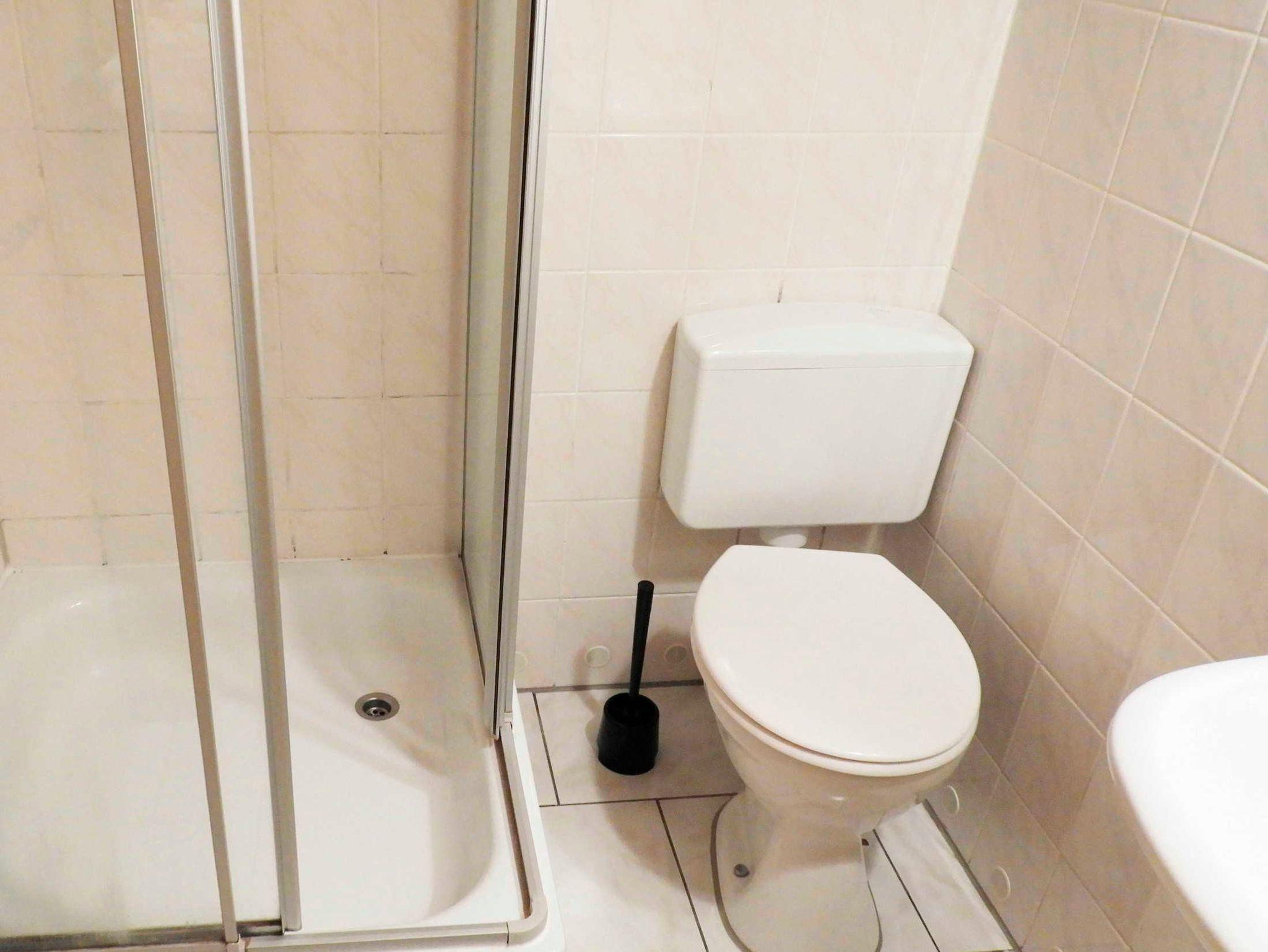 Im Bad befinden sich Dusche, Waschbecken und WC.