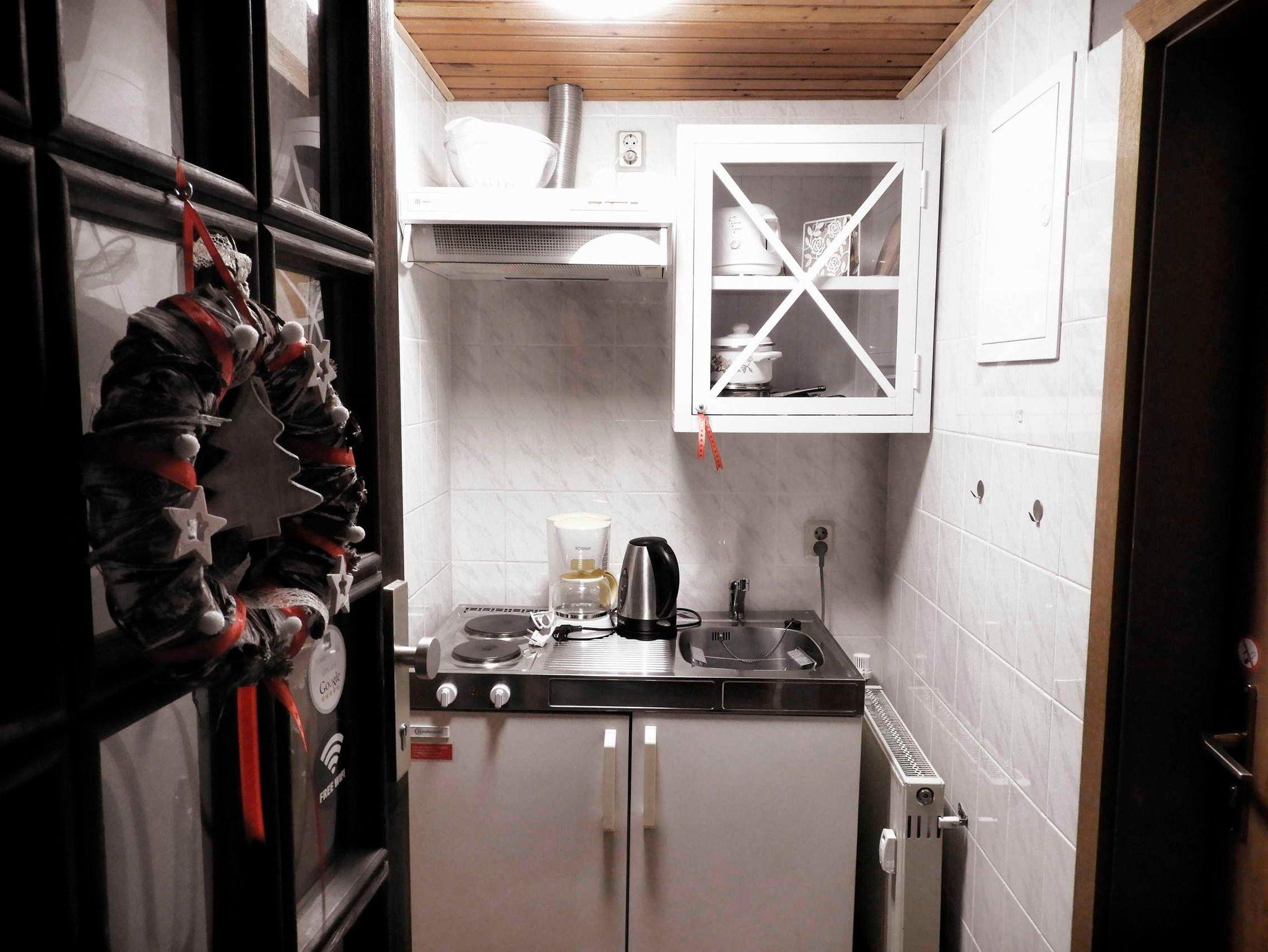Die eigene Pantryküche ist komplett ausgestattet mit Kühlschrank, Tiefkühlfach, Herd (2 Kochfeldern), Kaffeemaschine, Wasserkocher und Toaster sowie ausreichend Geschirr.
