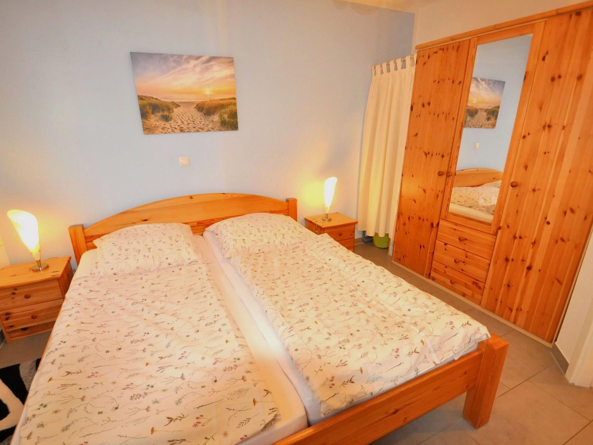 • Schlafzimmer: Doppelbett mit zwei Einzelmatratzen 90x200 m, Schrank, Nachttische, Lampen