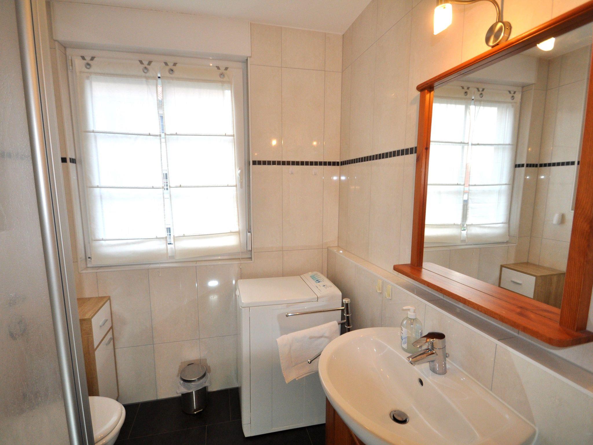 • Bad: mit Fenster, Dusche, Waschbecken, Toilette, Spiegel, Unterschrank Waschbecken, Waschmaschine