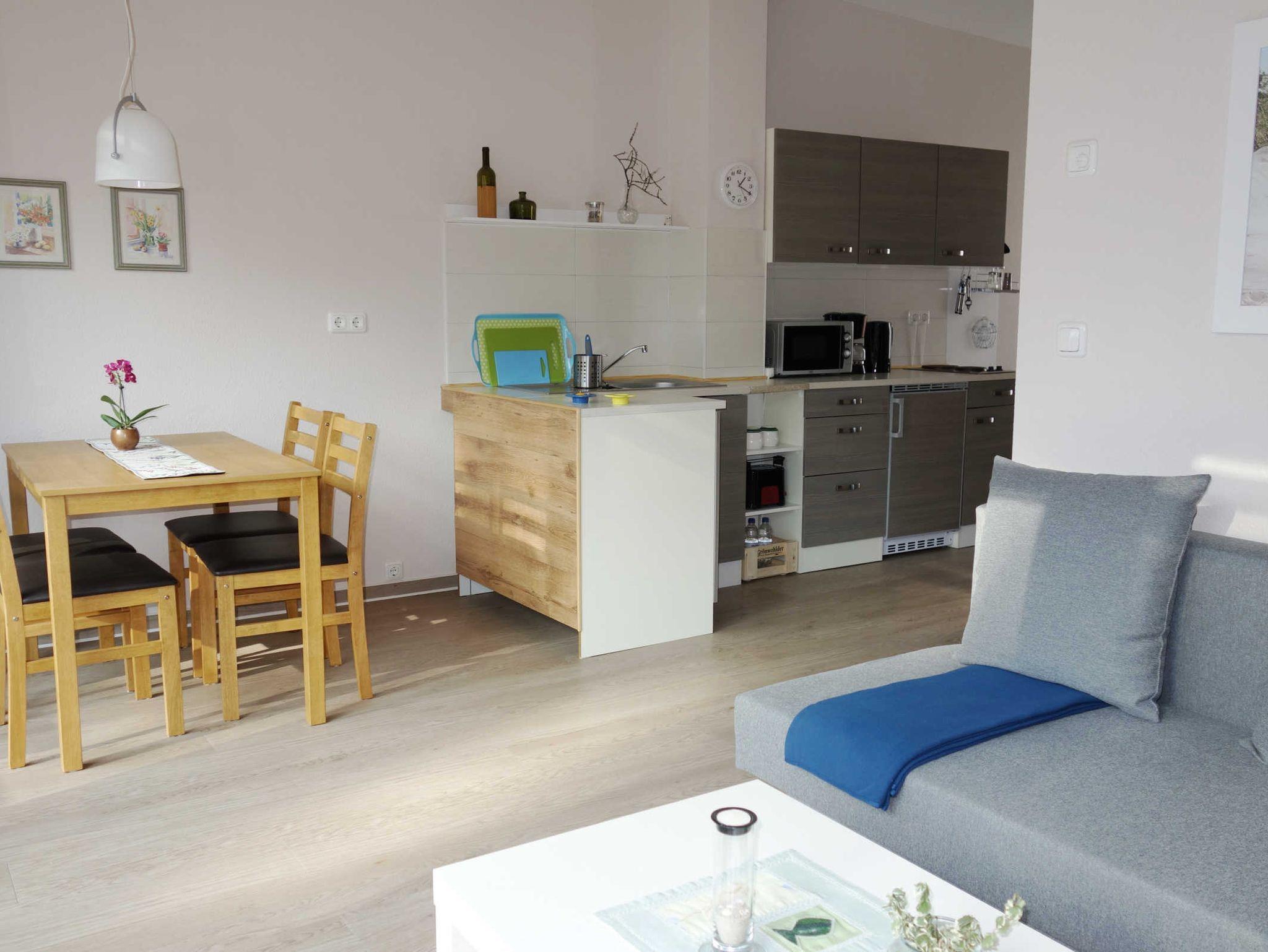 Die 2 Zimmer Ferienwohnung verfügt über ein Wohnzimmer mit einer Couch und einem Fernseher, eine offene Küche und ein Bad mit Dusche / WC. Zu der Ferienwohnung gehören außerdem ein PKW-Stellplatz und ein Balkon sowie ein abschließbarer Fahrradschuppen.