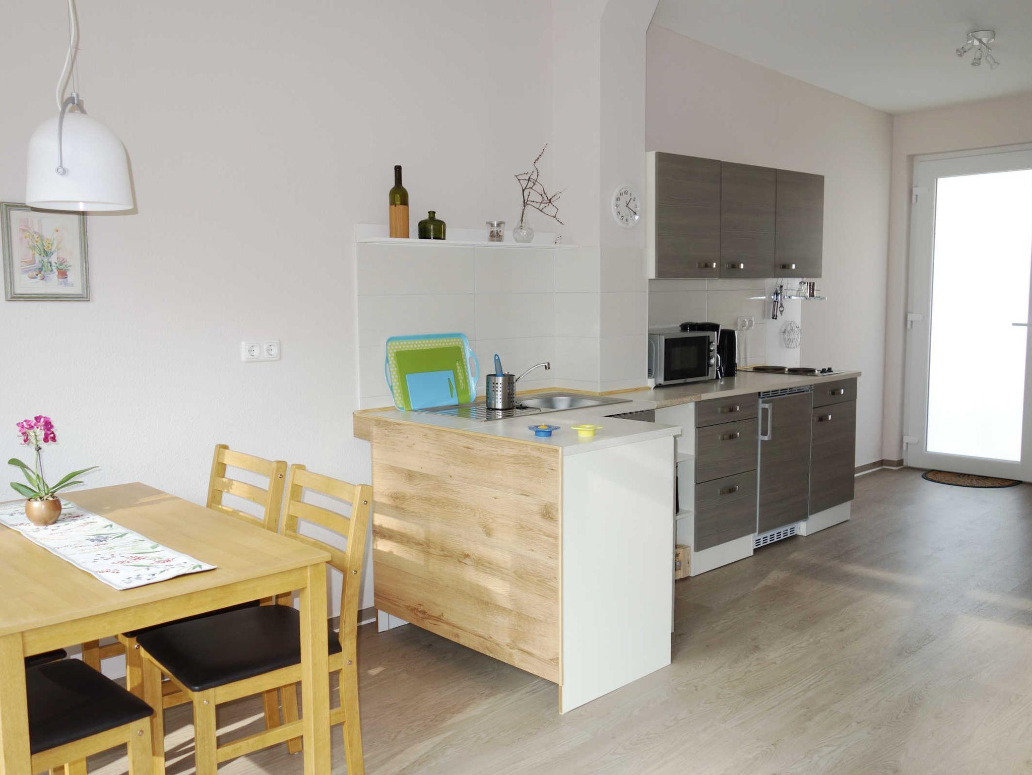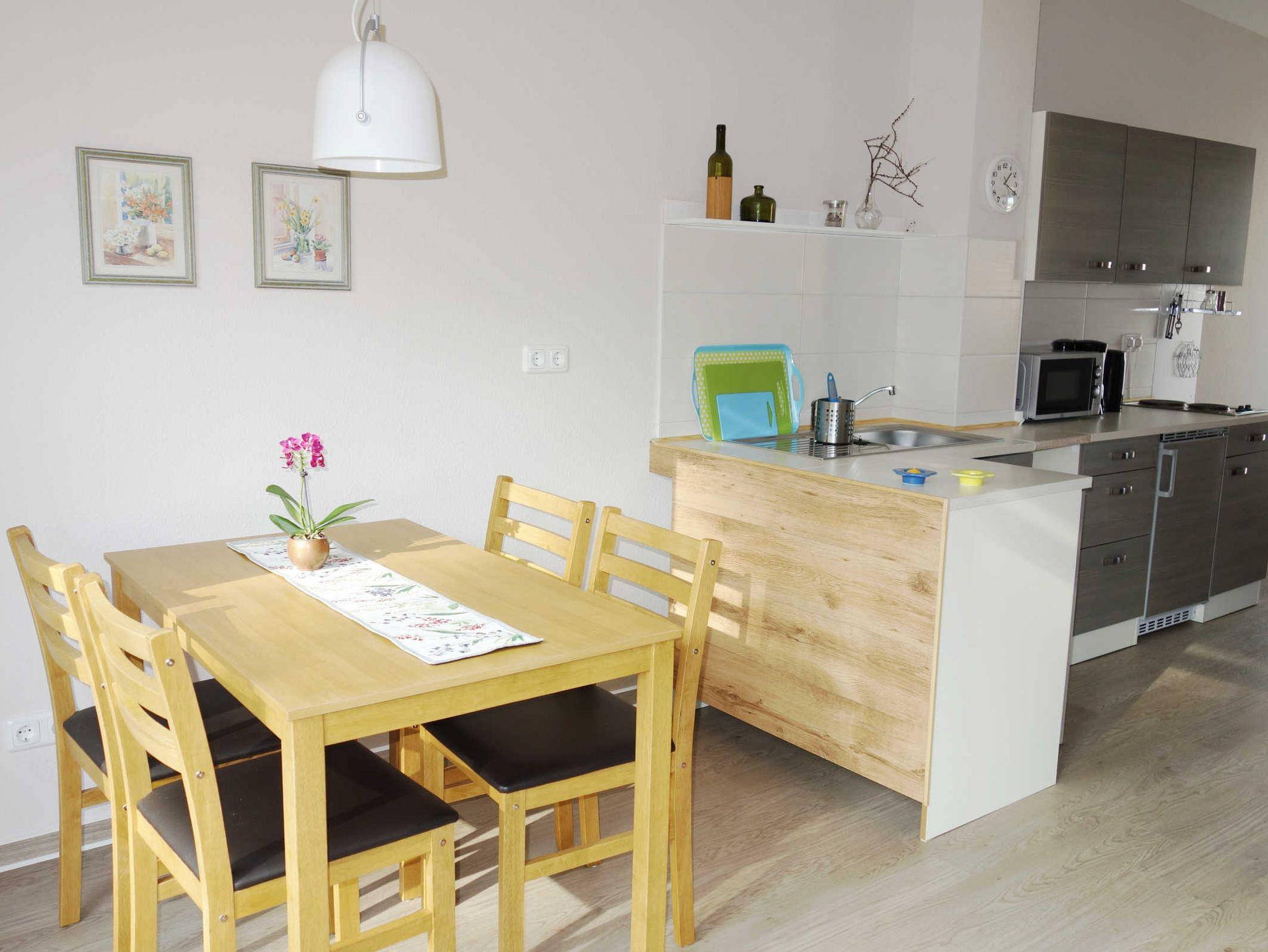 Die Küchenzeile ist u.a. mit einem Einbaukühlschrank mit Gefrierfach, 2 Kochplatten, einer Mikrowelle mit Grillfunktion, einem Wasserkocher, einem Toaster und einer Kaffeemaschine sowie einem Esstisch mit 4 Stühlen ausgestattet.