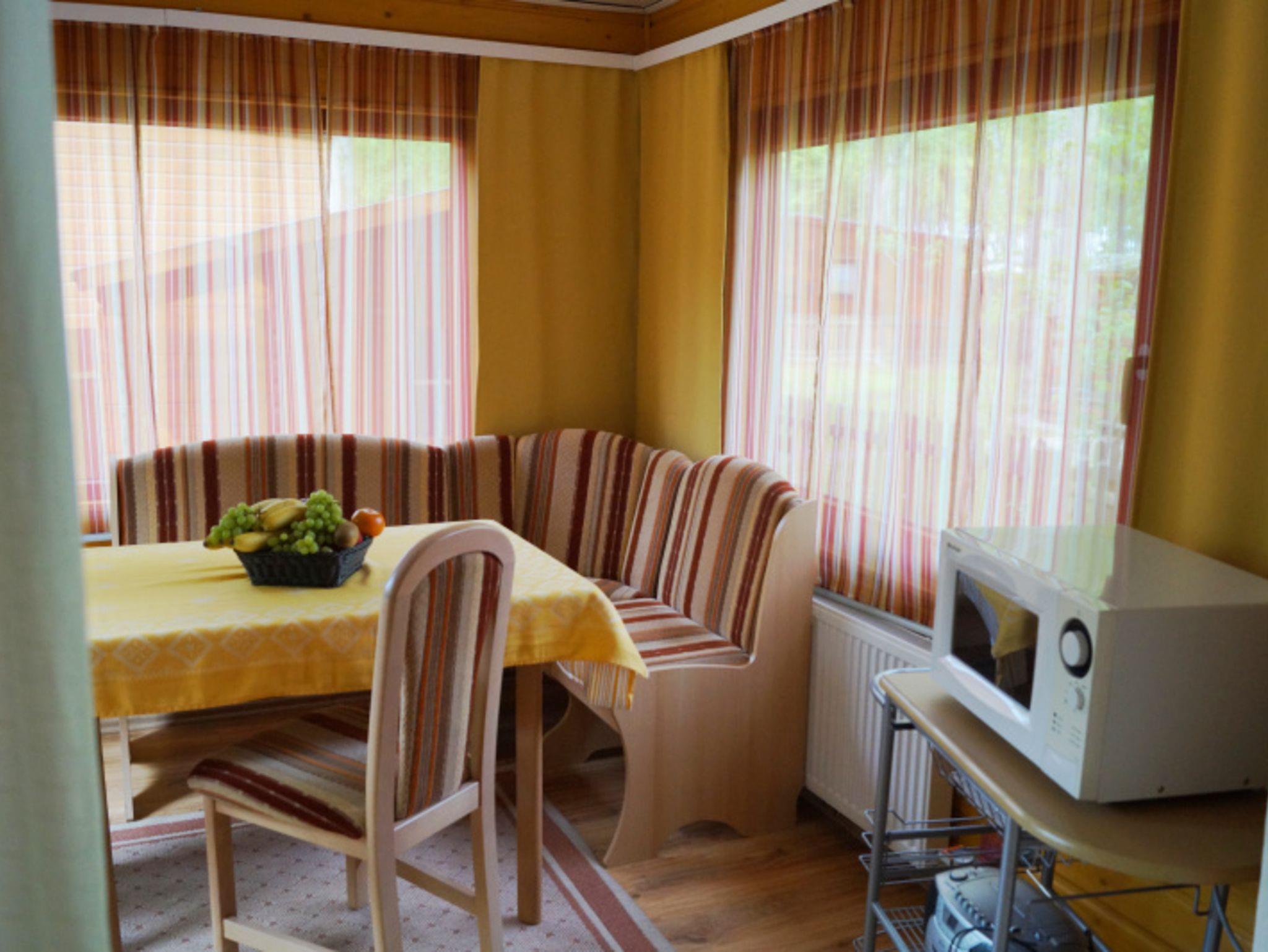 Im hellen Esszimmer ist der Esstisch mit 4 Stühlen sowie die Mikrowelle.