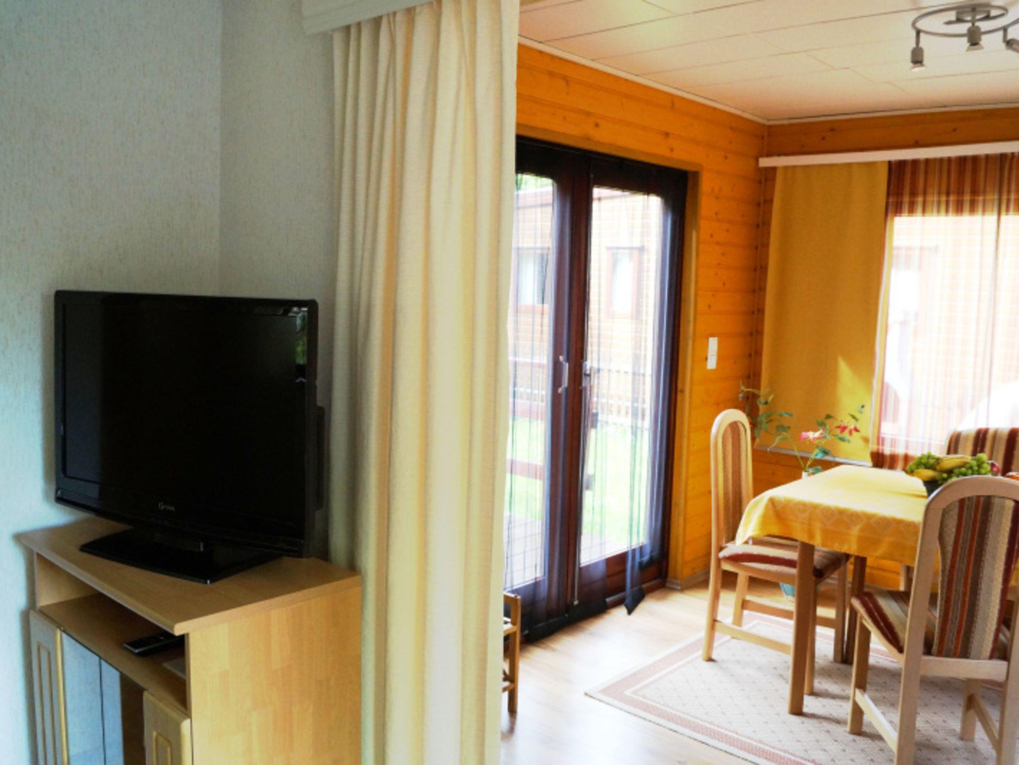 Im Wohnzimmer steht eine Couch sowie ein Flachbildfernseher.