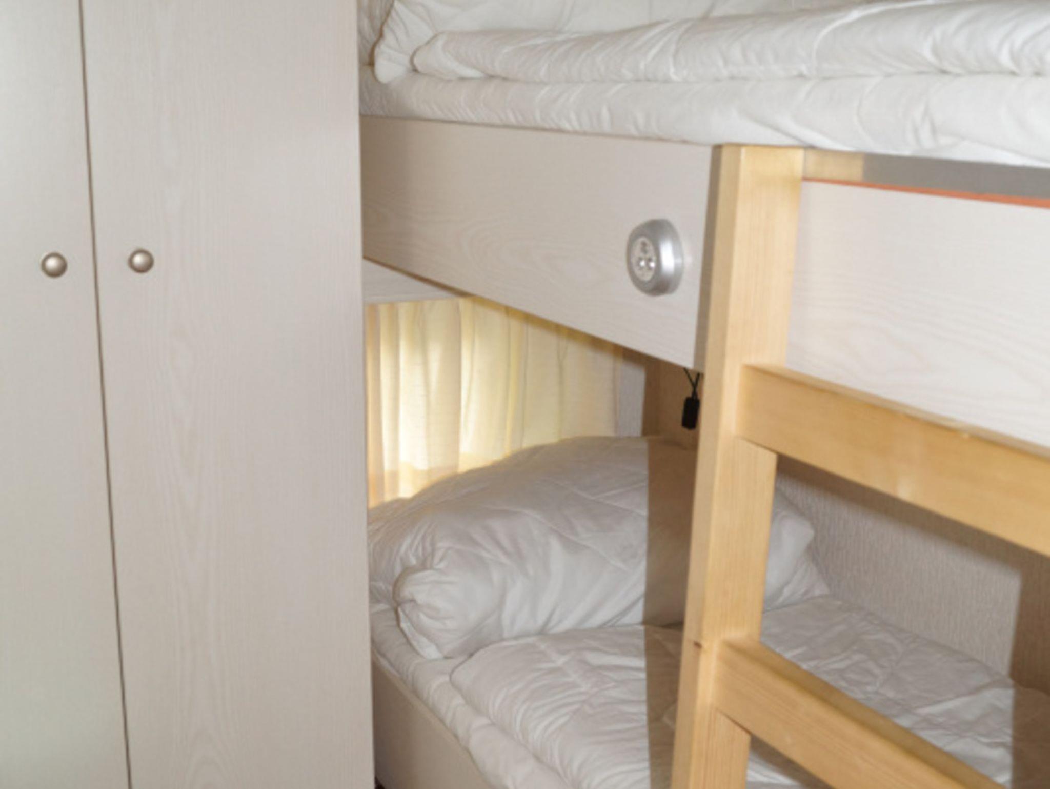Ein Doppelbett steht in dem einem Schalzimmer, ein Etagenbett in dem anderem Schlafzimmer.