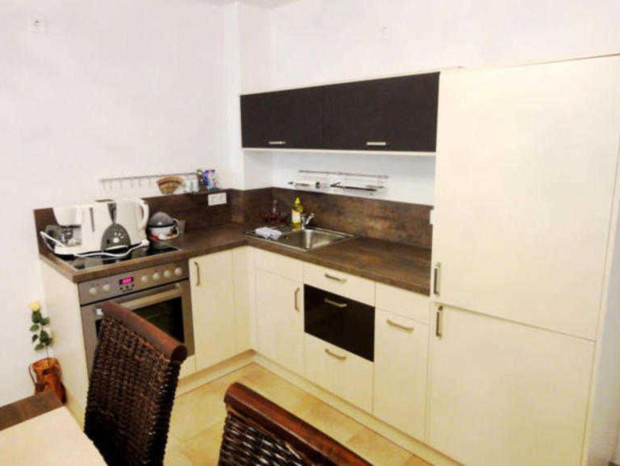 Im integrierten Küchenbereich befinden sich unter anderem ein Herd mit 4 Ceranfeld-Kochplatten, ein Kühlschrank, ein Ofen, eine Kaffeemaschine und ein Wasserkocher.