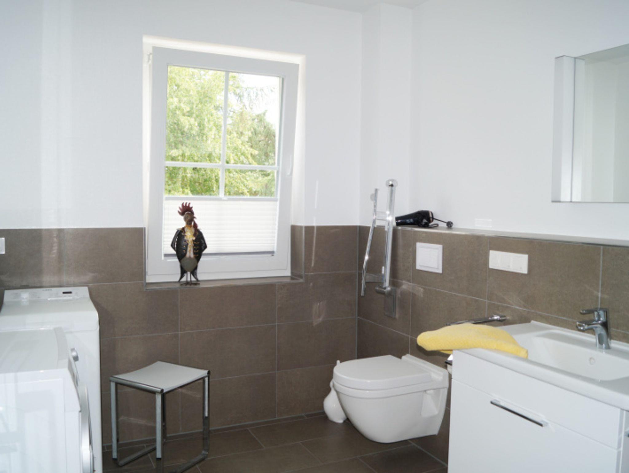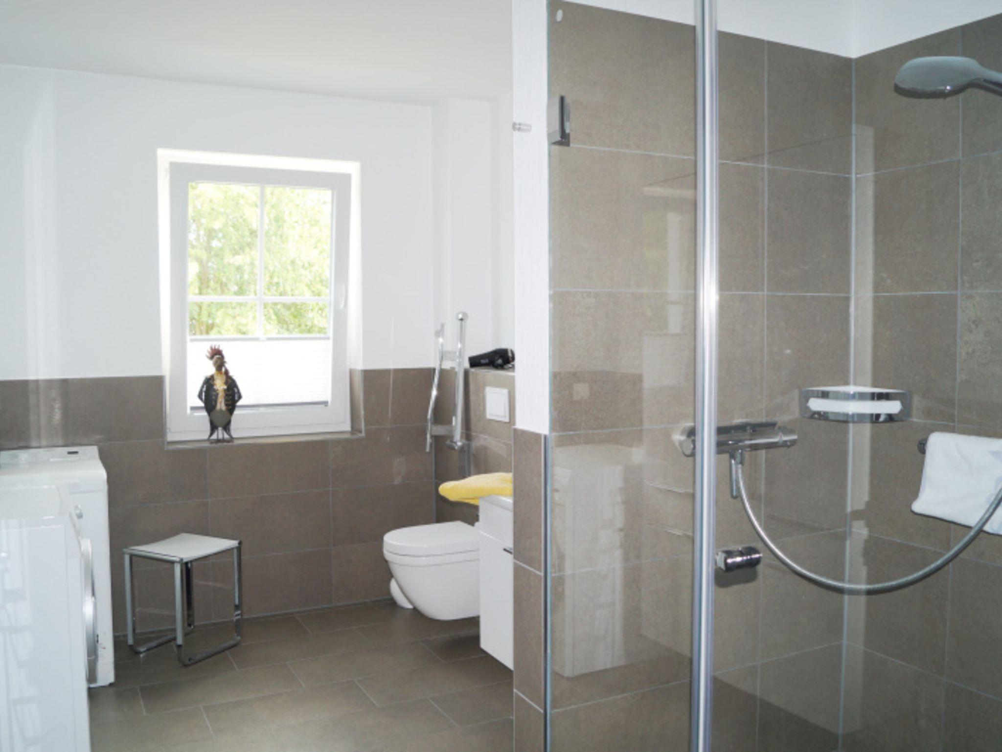 Das geflieste Bad mit Fenster hat eine bodengleiche Dusche, ein WC, einen Waschtisch, einen Föhn sowie eine Waschmaschine und einen Trockner.