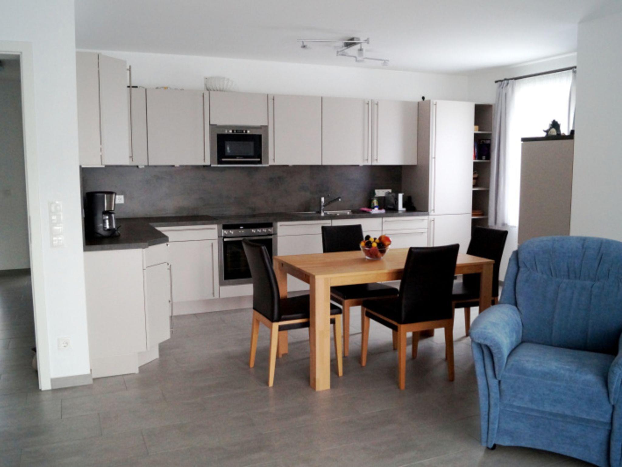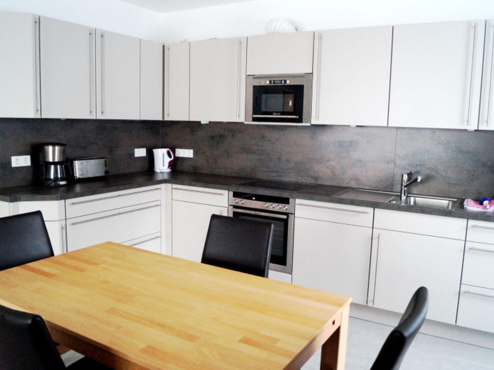 Die zum Wohnzimmer offene Küche ist vollständig ausgestattet, u.a. mit einem Induktions-Herd (4 Platten), einem Geschirrspüler, einem Kühlschrank, einem Gefrierfach, einer Mikrowelle, einer Kaffeemaschine und einem Wasserkocher. Zusätzlich sind in der Küche noch ein Handrührgerät mit Pürierstab und eine Küchenmaschine (zum raspeln).