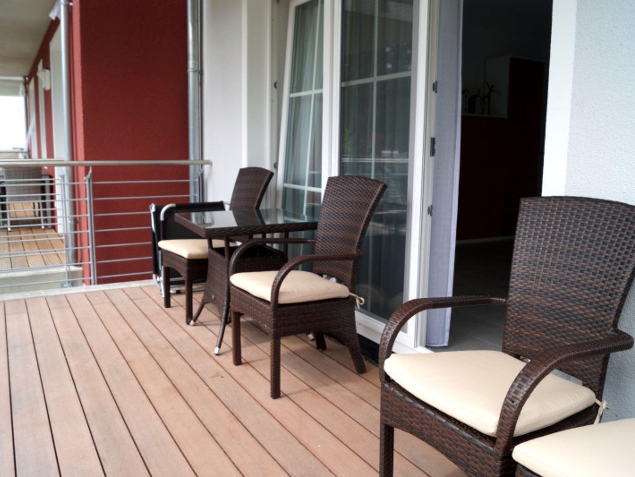 Zu der Wohnung gehört außerdem ein großer Süd-Balkon mit Sitzmöbeln und ein PKW-Stellplatz.