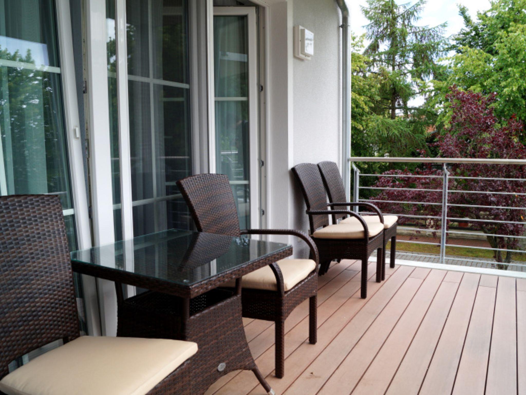Zu der Ferienwohnung gehören außerdem ein Balkon mit Gartenmöbeln und ein PKW-Stellplatz.
