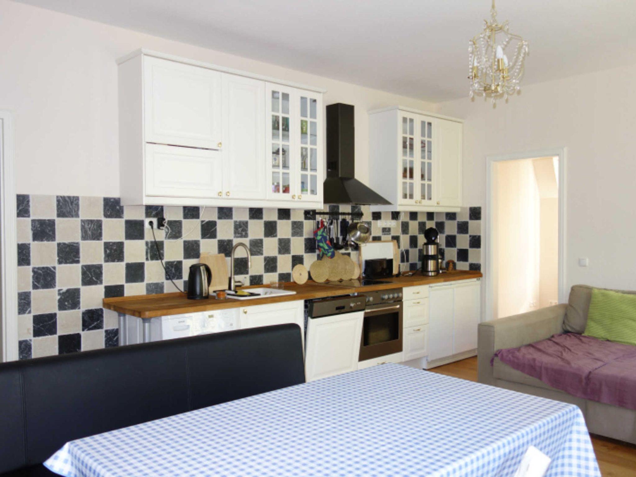 Die Ferienwohnung verfügt über ein Wohnzimmer mit Fernseher und Couch, eine Küchenzeile mit Backofen, Geschirrspüler und Kühlschrank, 2 Schlafzimmer (eines mit Doppelbett und eines mit Etagenbett) sowie ein Bad mit Badewanne, WC und Waschtisch.
