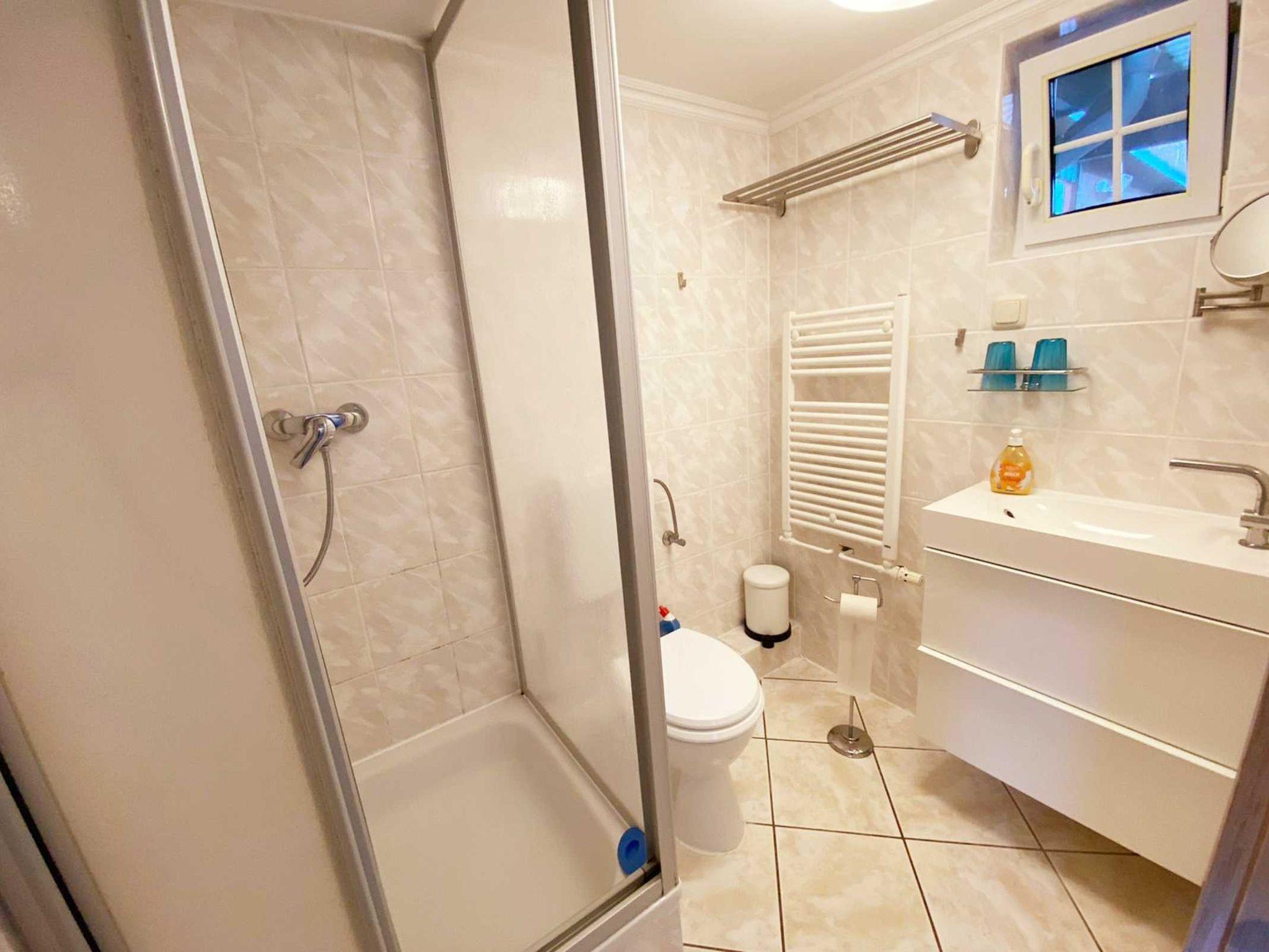 • Badezimmer: im kleinen aber feinen Badezimmer befindet sich eine Dusche, Toilette, Waschbecken mit Unterschrank und Handtuchhaken.