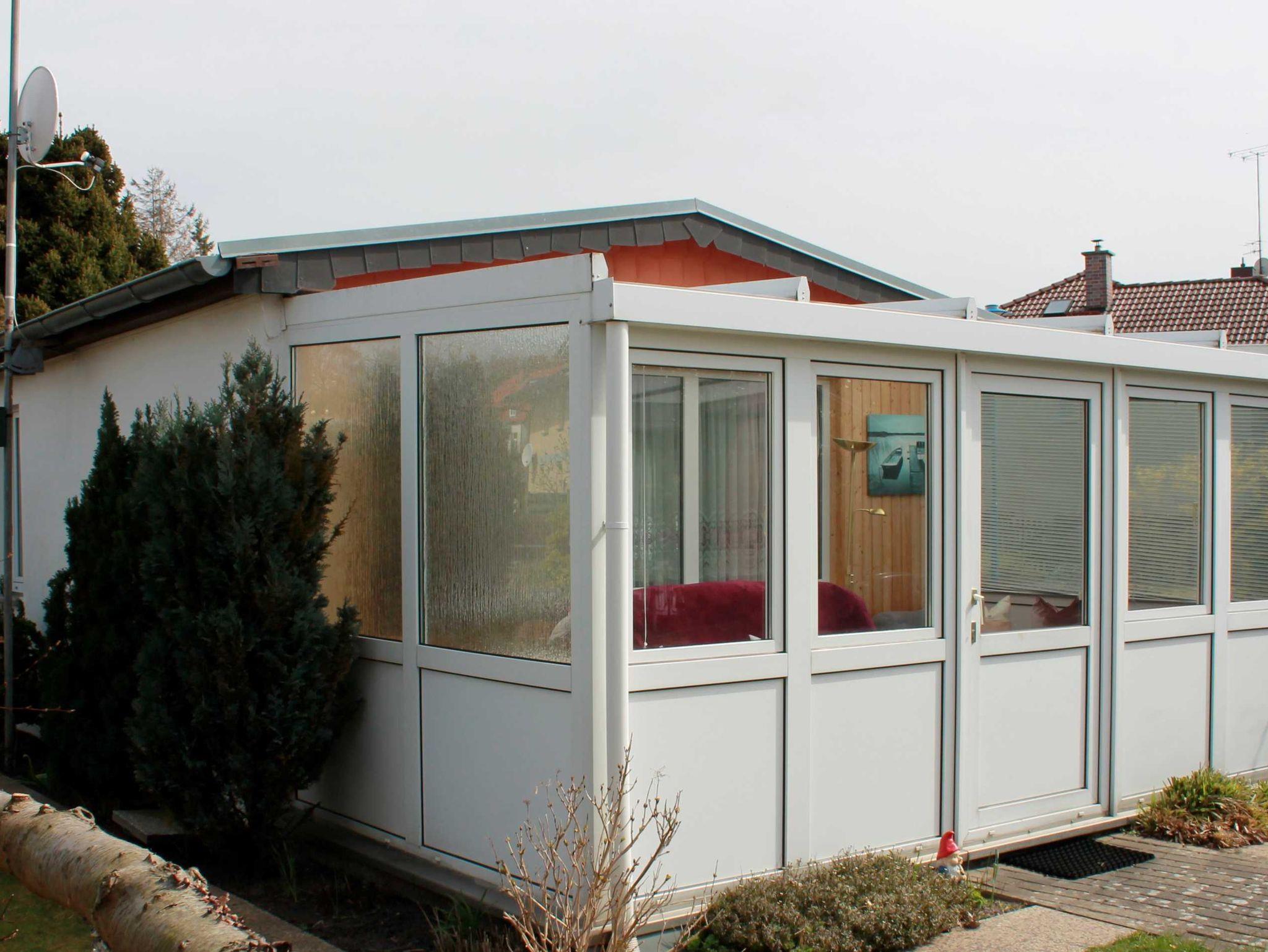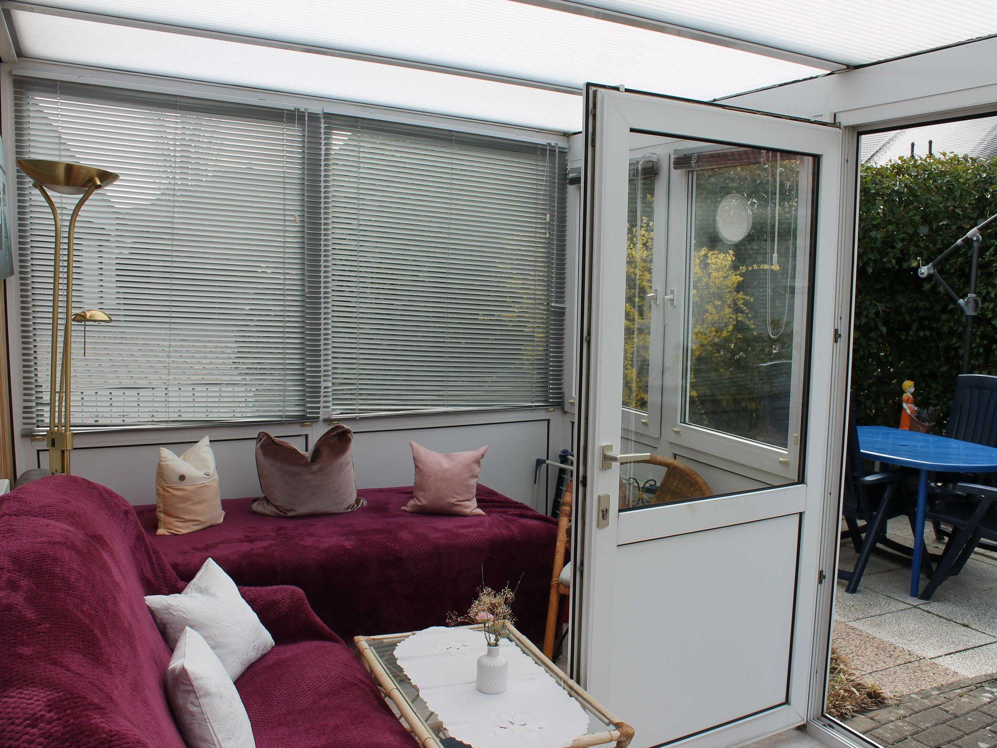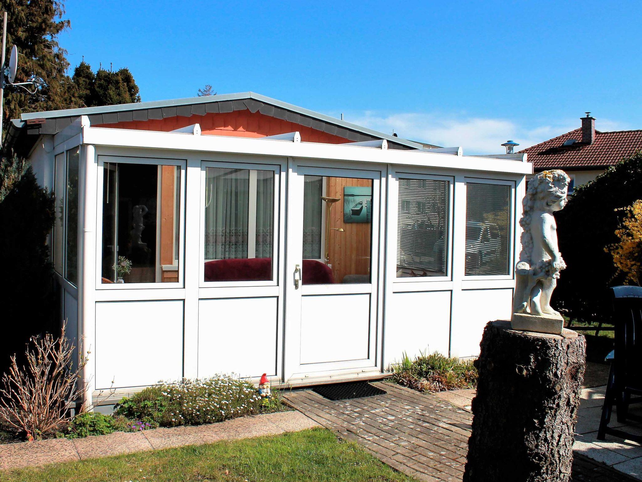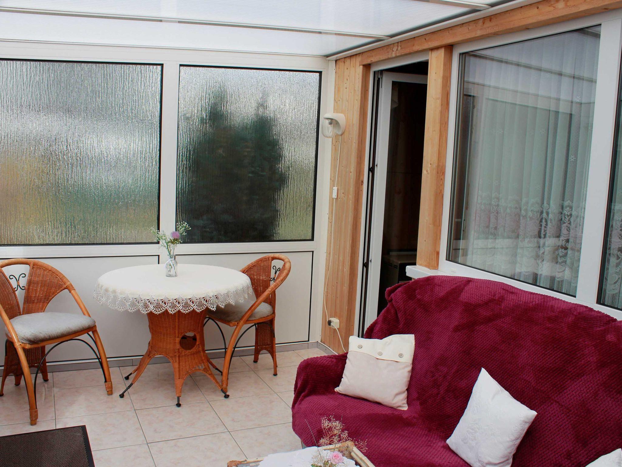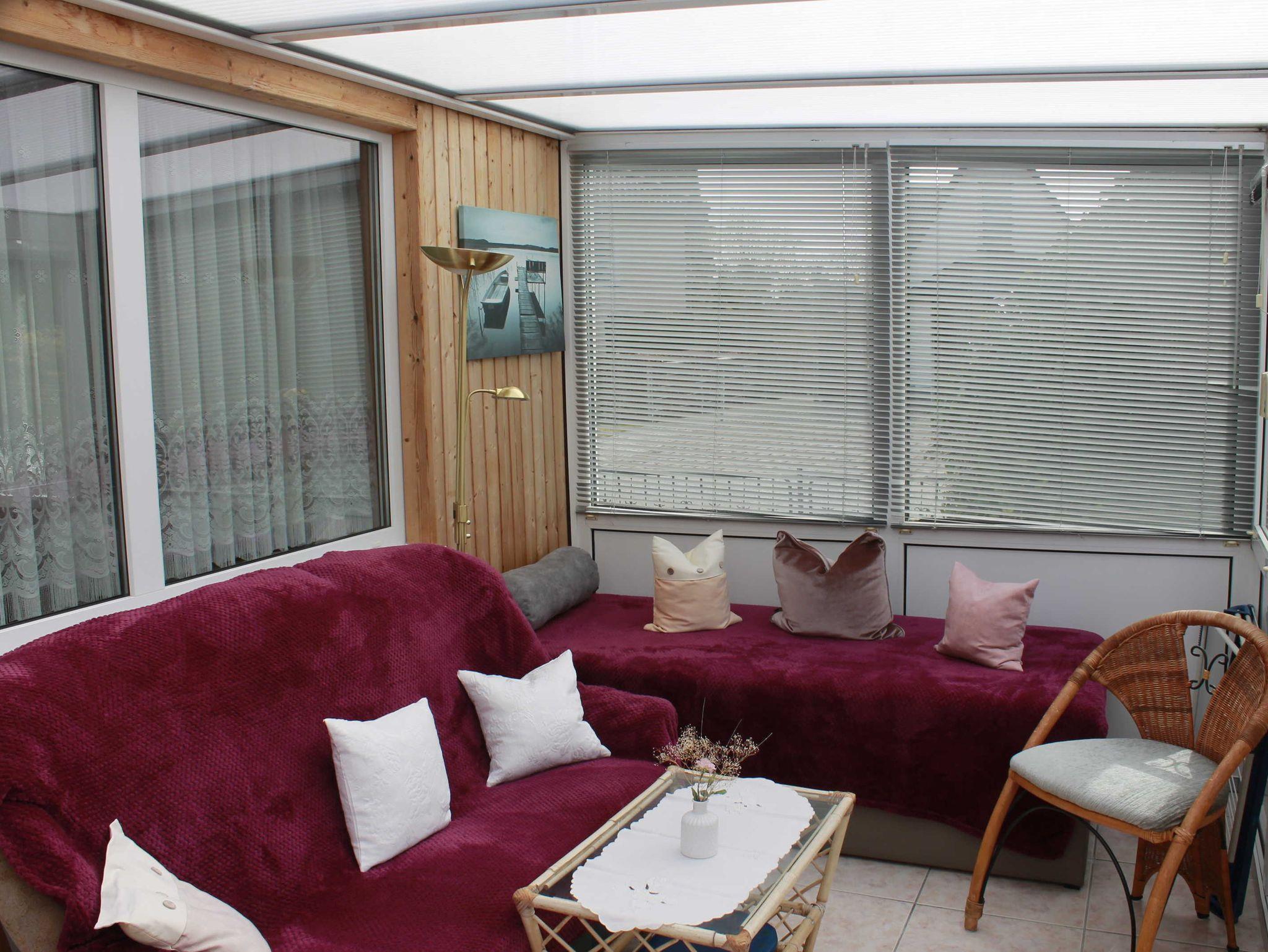 Im Wintergarten kann die Schlafliege für eine zusätzliche Aufbettung genutzt werden. Der Parkplatz befindet sich vor dem Grundstück.