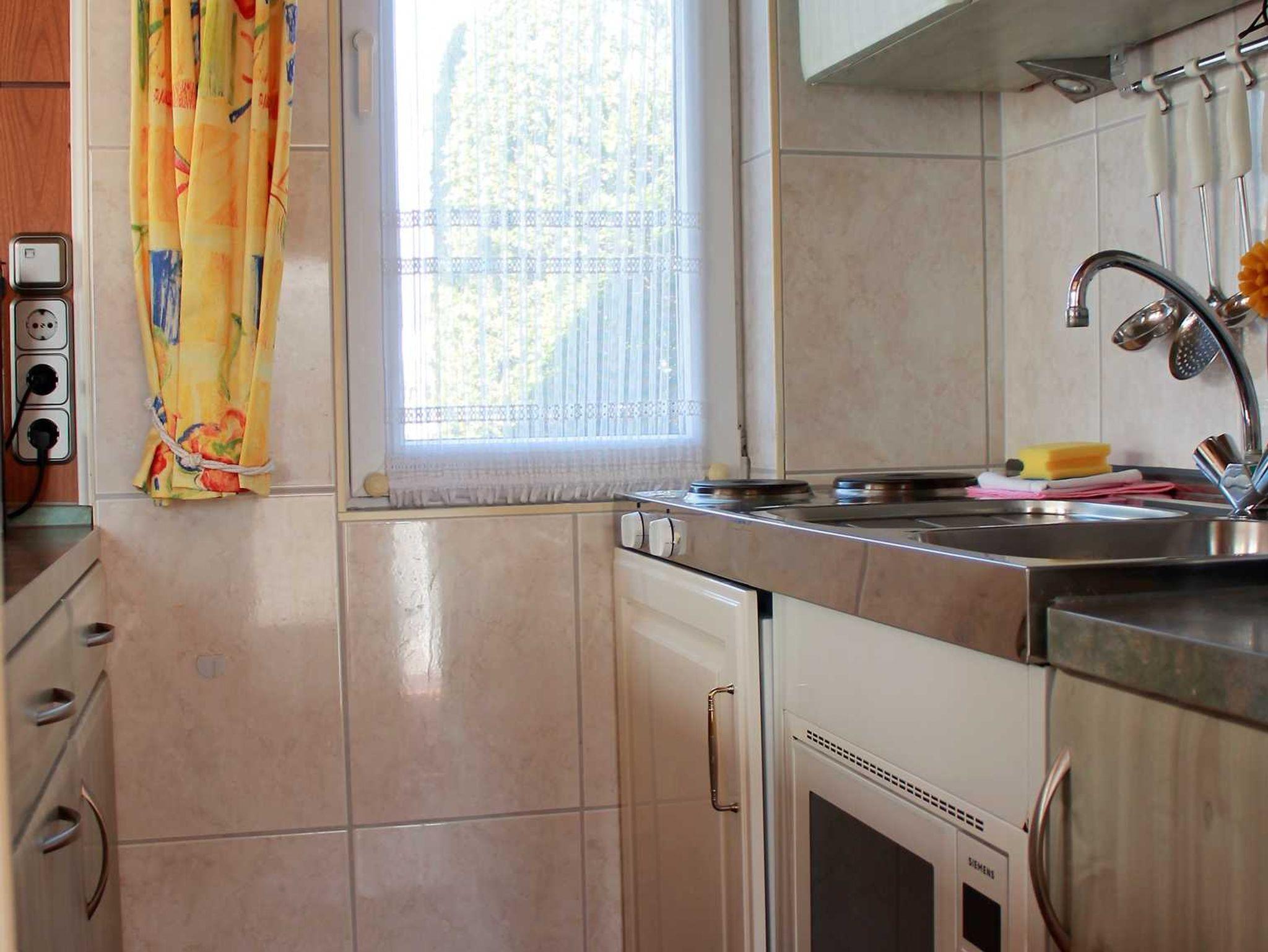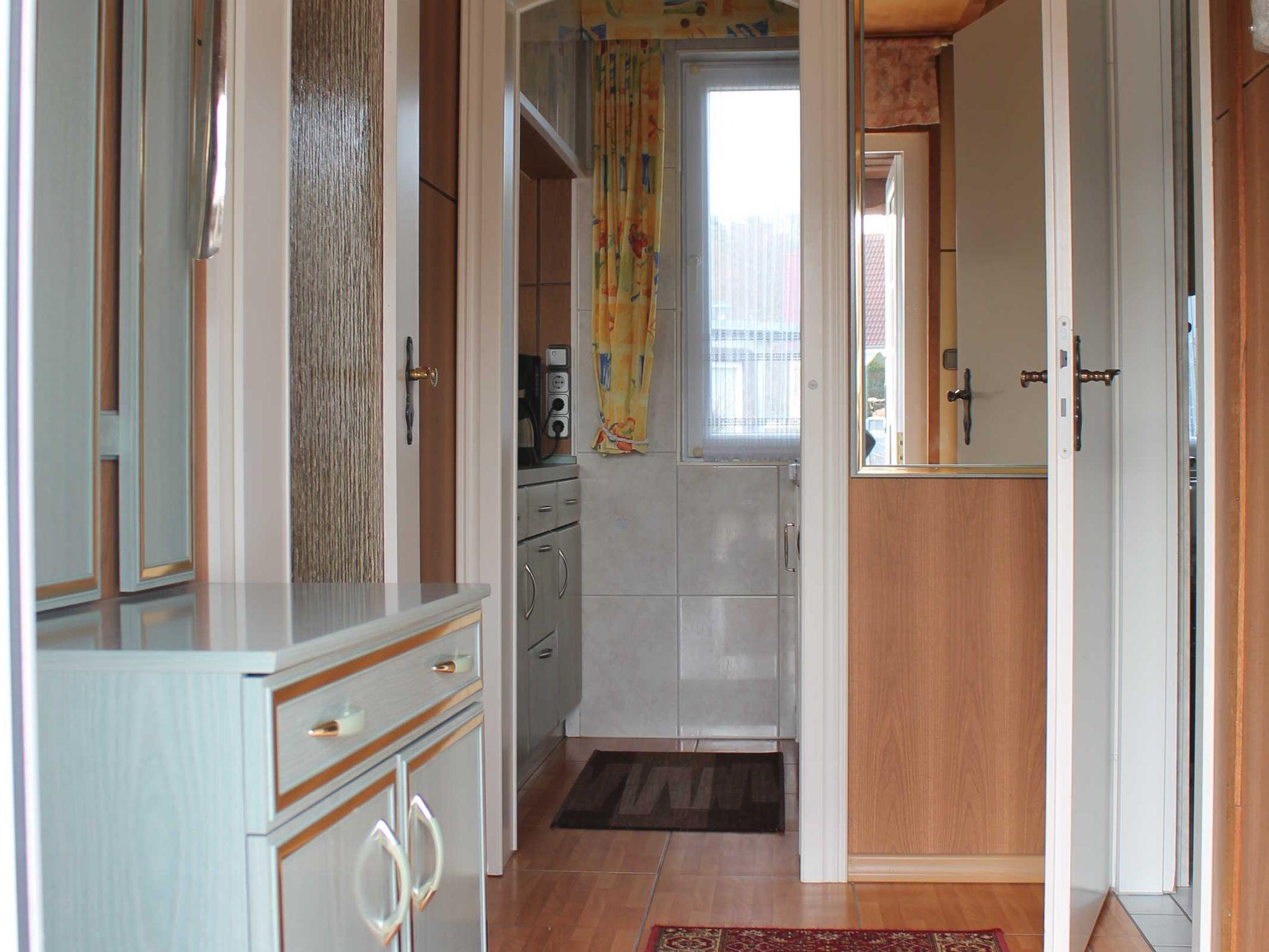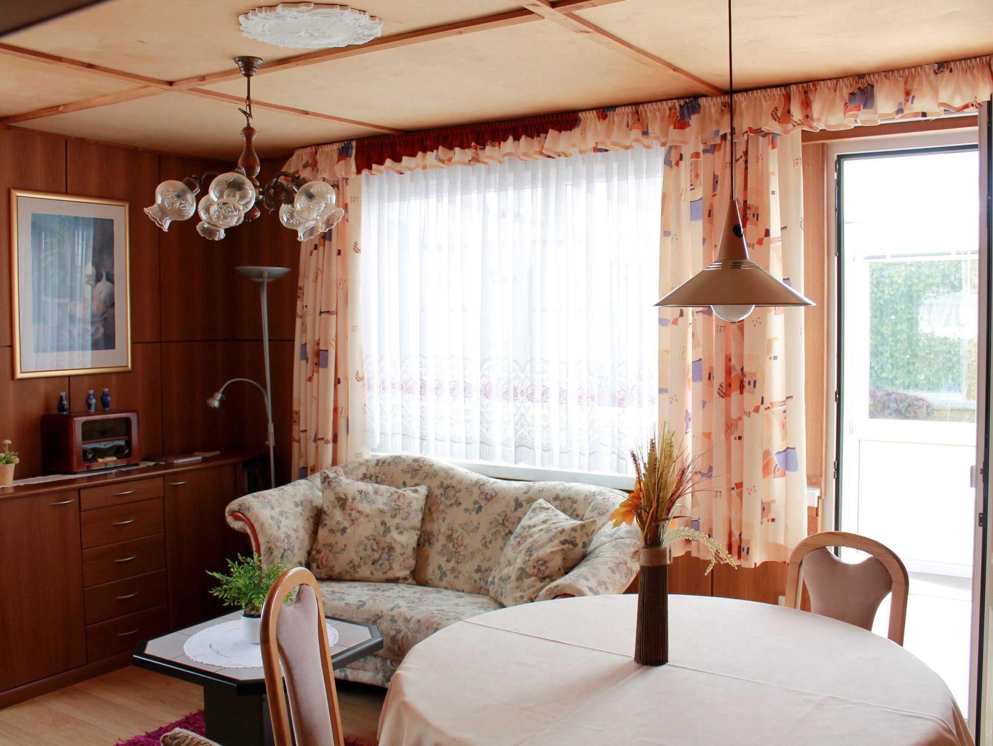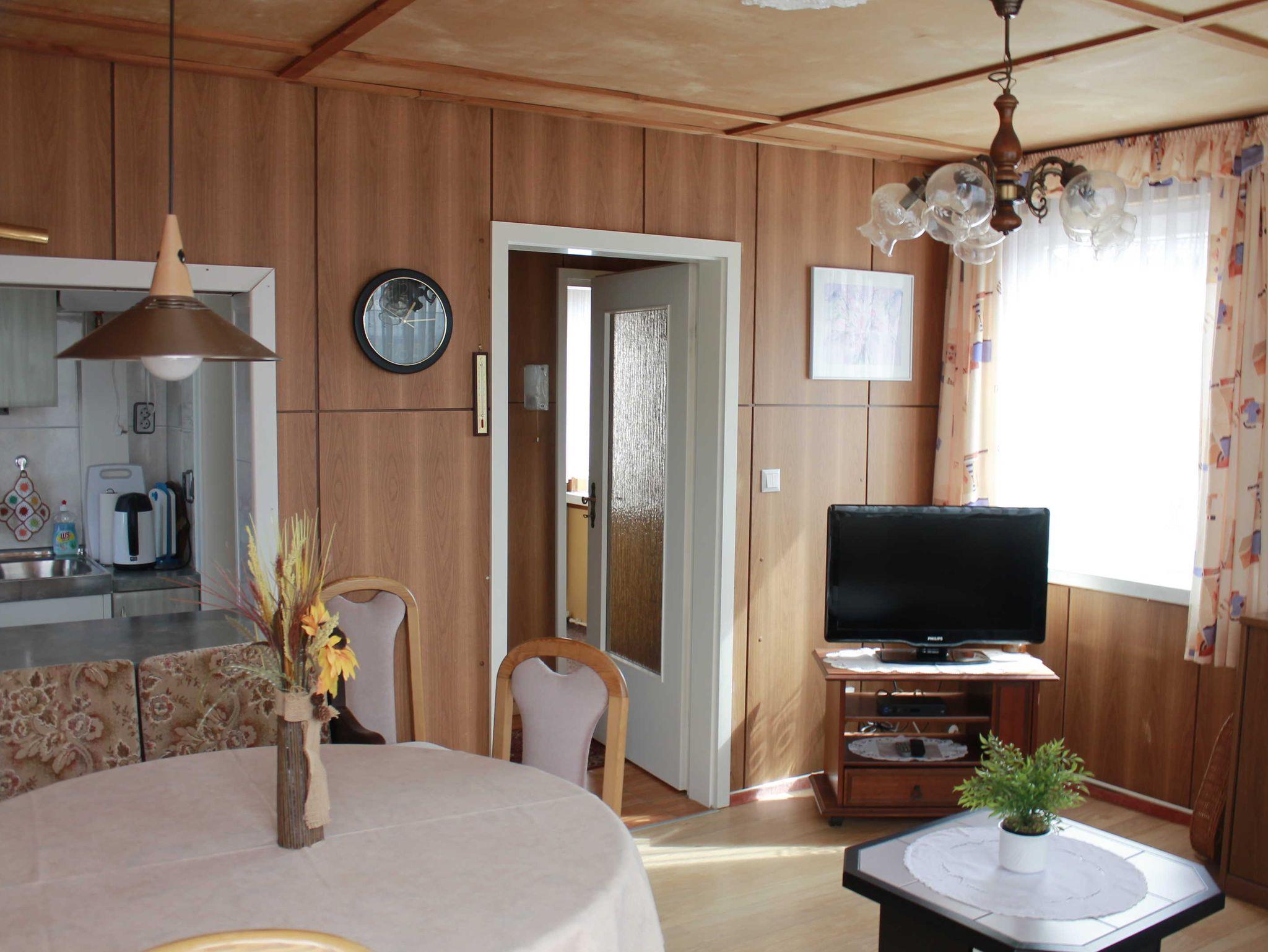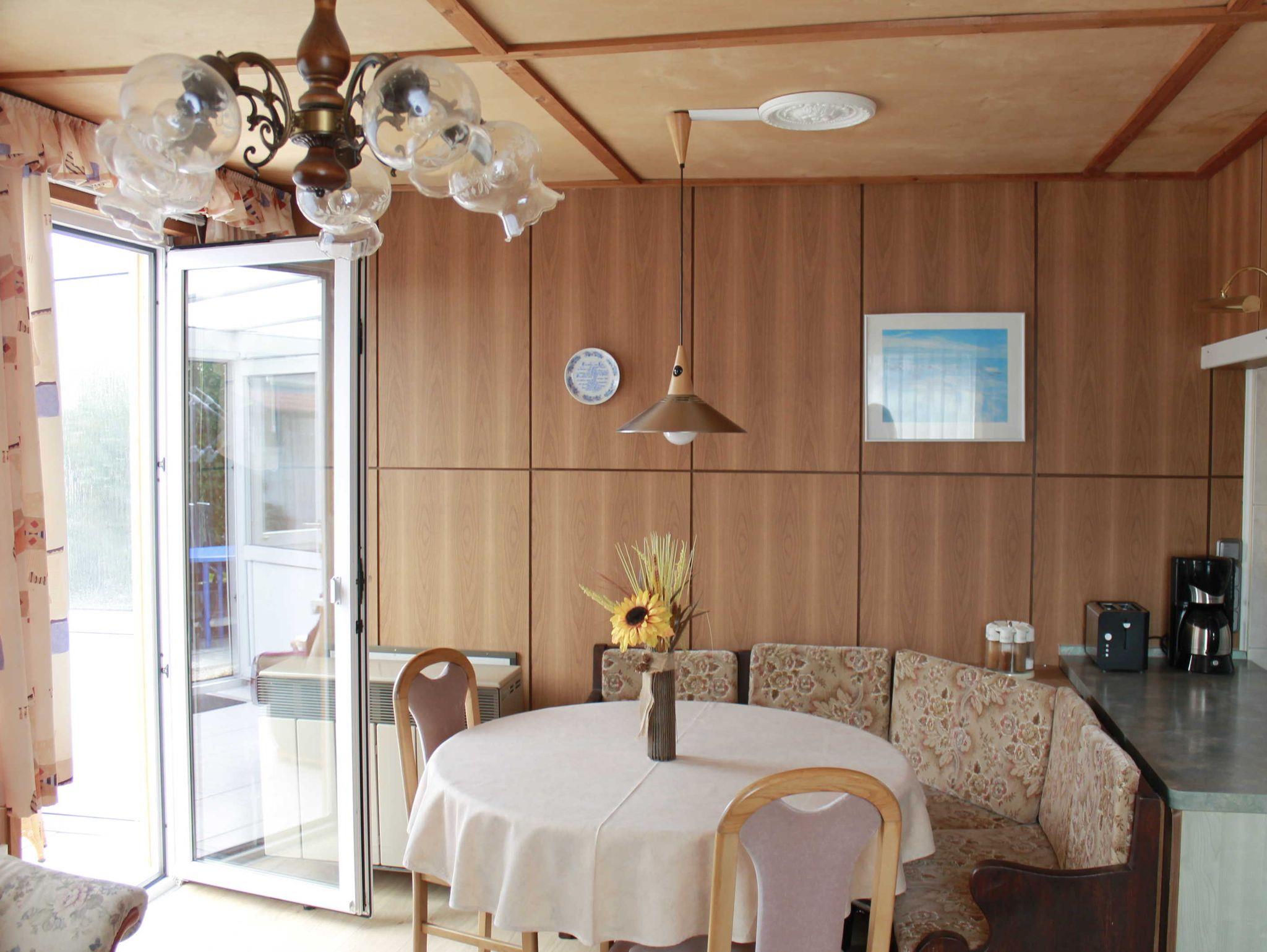 Das Wohnzimmer mit Couch und Eßecke tragen zur Gemütlichkeit bei. Die Küche mit Durchreiche bietet allen Komfort.