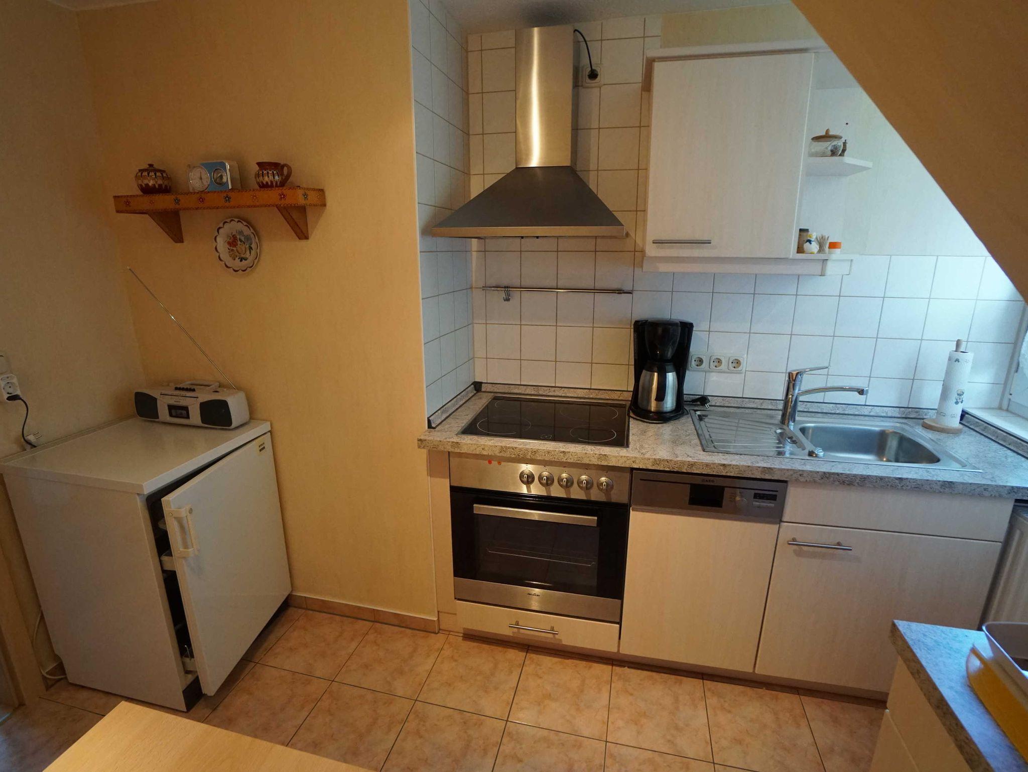 In der modernen Küche finden sich neben dem E-Herd mit Glaskeramik-Kochfeld und Backofen auch ein Geschirrspüler, Kühlschrank, Kaffeemaschine, Wasserkocher, Toaster und weitere Küchengeräte.