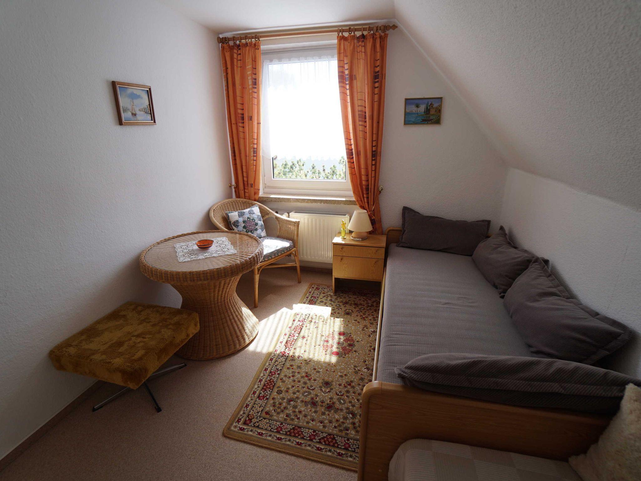 Die Ferienwohnung im Obergeschoß unseres Einfamilienhauses ist ca. 65 m² groß und bietet Platz für 2 bis 3 Personen. Neben dem eigenen Parkplatz (gegen Gebühr) und Fahrradstellplatz können Sie gern die Sitzecke und Liegewiese in unserem Garten benutzen.
