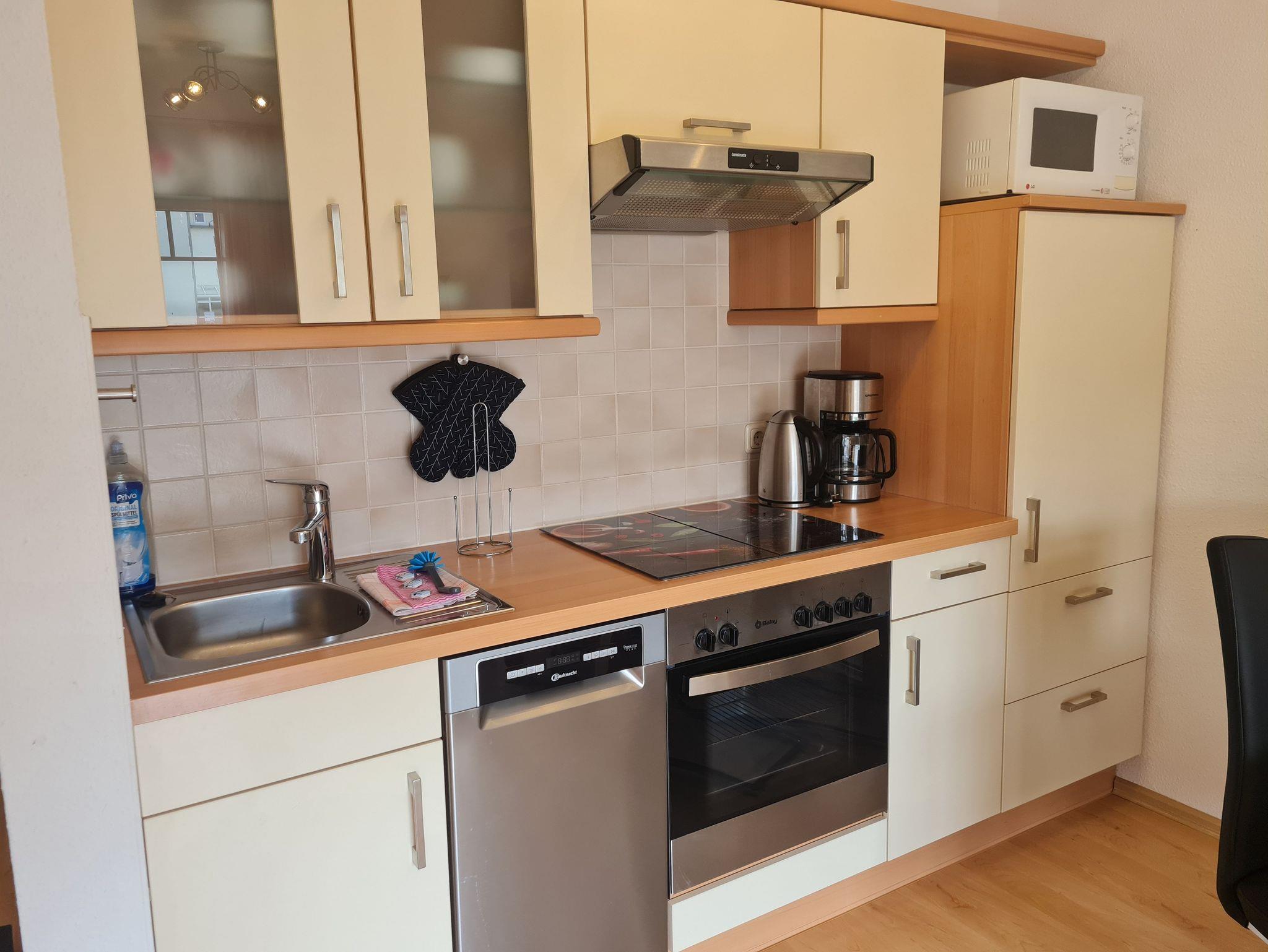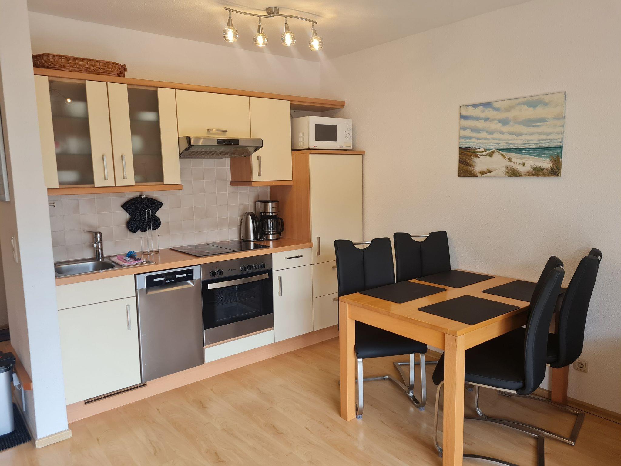 • Küche und Essbereich für 4 Personen offen zum Wohnzimmer, komplett eingerichtete Einbauküche mit Backofen, Ceranfeld, Geschirrspüler, Toaster, Kaffeemaschine, Wasserkocher, Kühlschrank, Mikrowelle