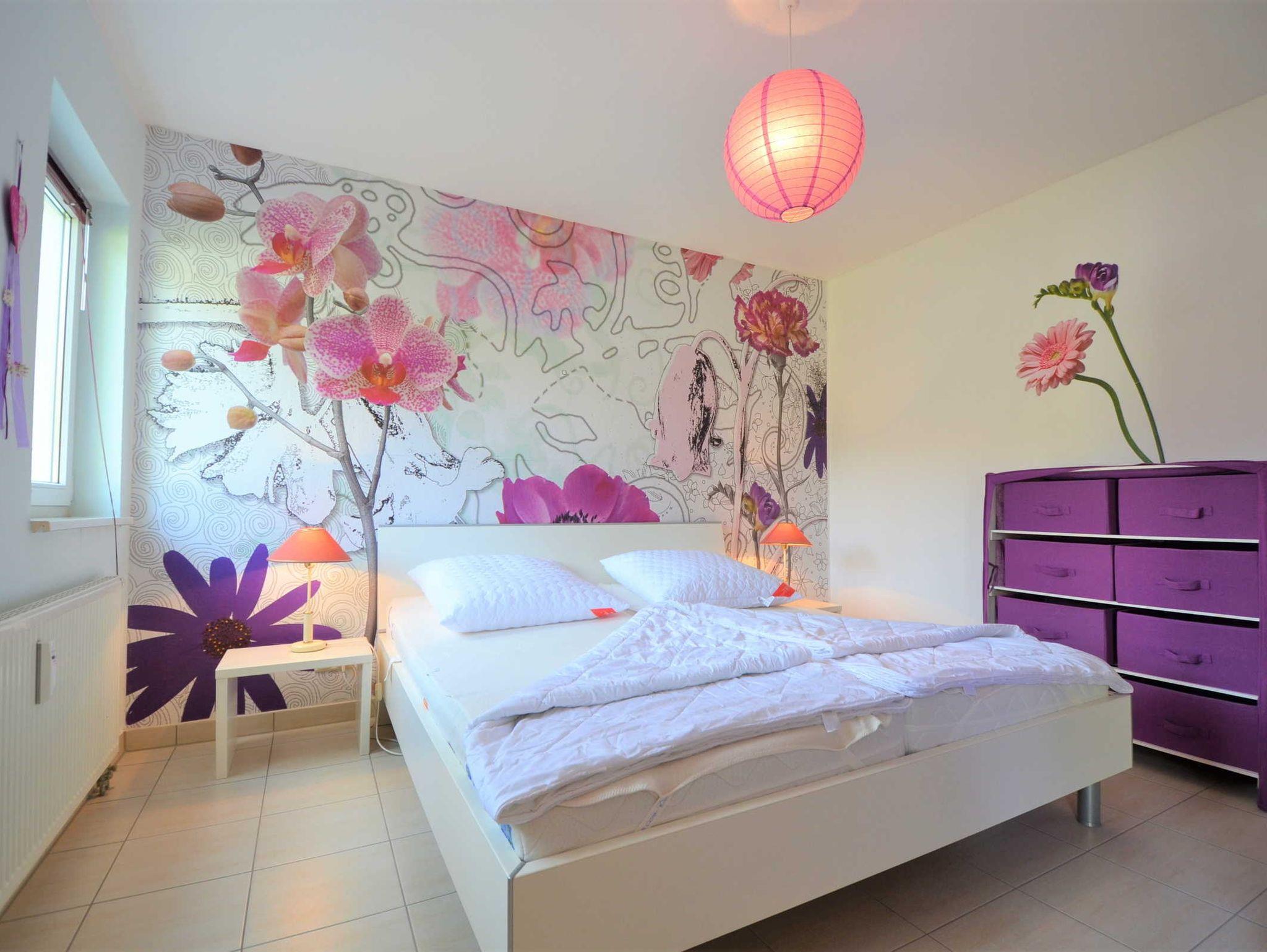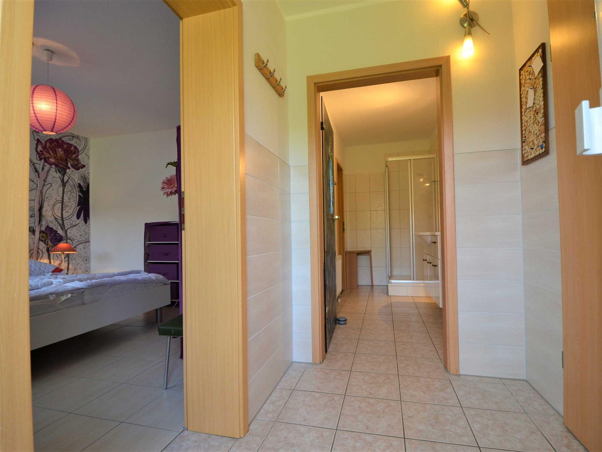 Das Schlafzimmer ist mit einem Doppelbett eingerichtet. Das Badezimmer ist mit Dusche und WC ausgestattet.