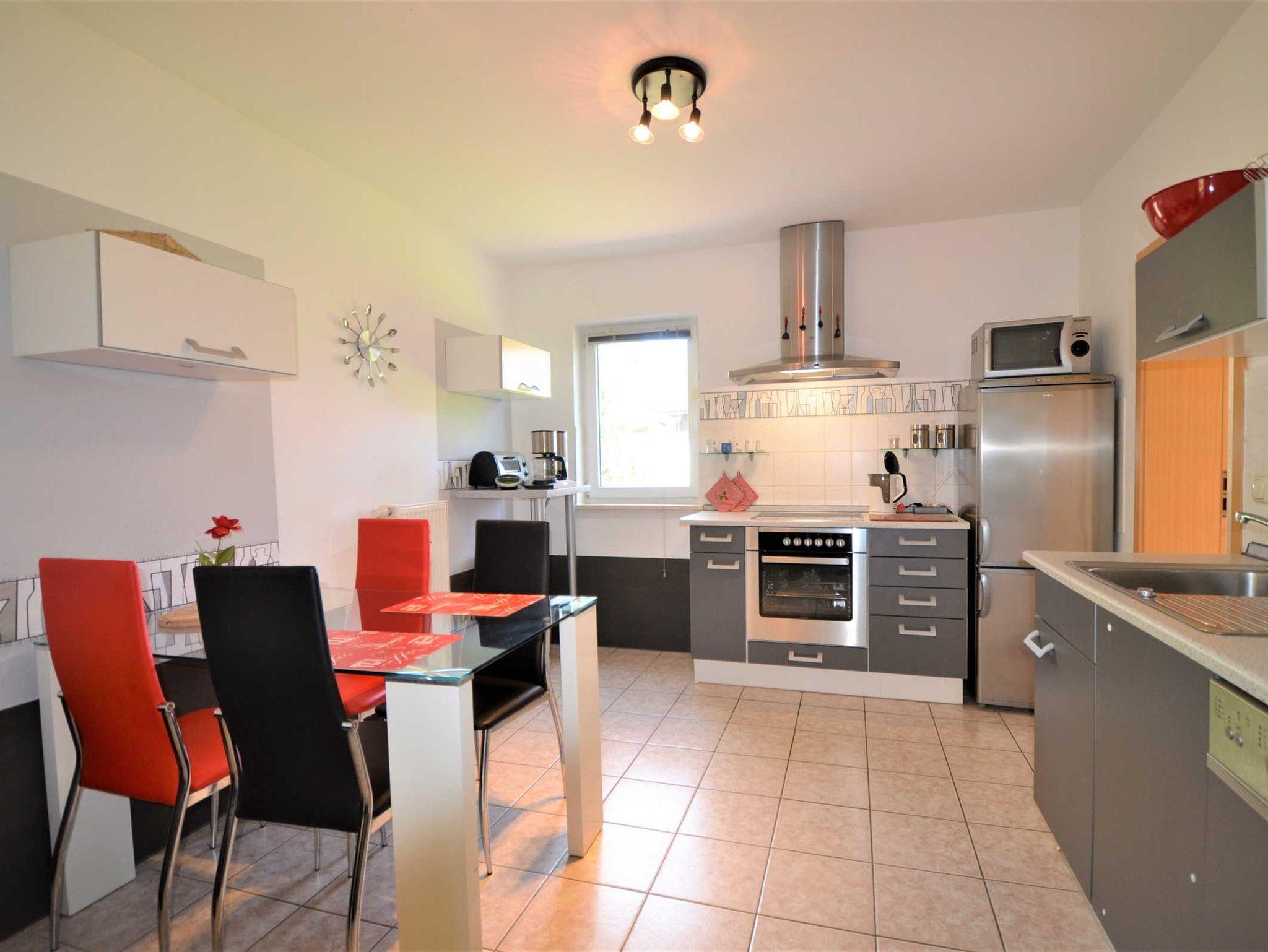 Das Wohnzimmer mit bodentiefen Fenstern bietet Ihnen eine großzügige und bequeme Couch sowie einen Flachbild-Fernseher. Die Küche ist mit einem Esstisch und einer modernen Küche ausgestattet. Hier finden Sie Sie alle notwendigen Koch- und Ess-Utensilien. Als Küchengeräte stehen Ihnen u.a. Backofen, Kühlschrank, Mikrowelle, Spülmaschine, Kaffeemaschine und Toaster zur Verfügung.