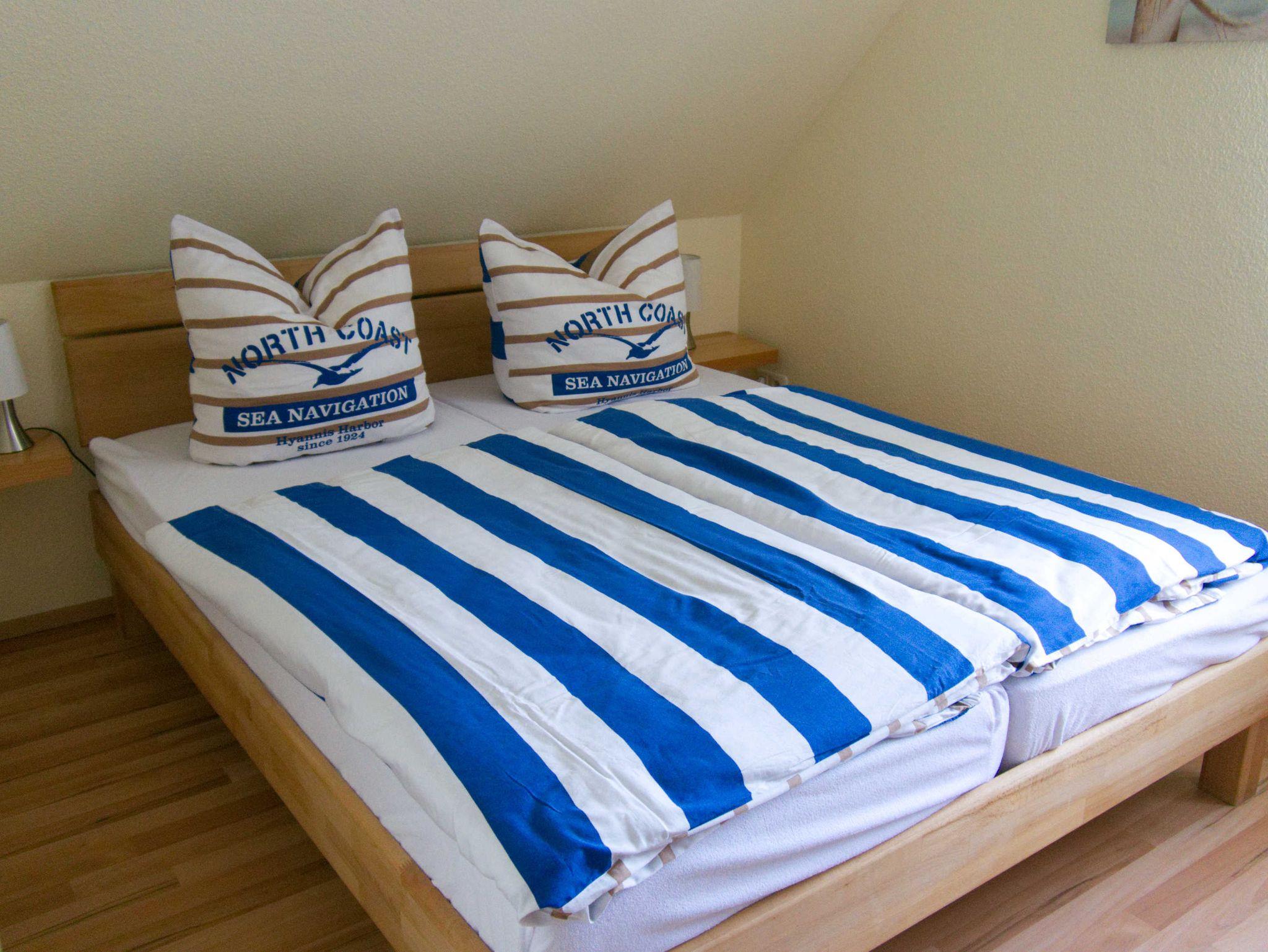 Im OG befinden sich drei Schlafzimmer: Schlafzimmer 1 mit Doppelbett (180 x 200 cm) incl. Flachbildschirm, Schlafzimmer 2 mit zwei Einzelbetten (jeweils 90 x 200 cm), Schlafzimmer 3 mit einem Doppelbett (160 x 200 cm) sowie ein Wannenbad inkl. diverser Ablageflächen/Haken. Für ein Kleinkind ist ein Reisebett inkl. extra Matratze und Bettzeug und ein Hochstuhl verfügbar. In beiden Bäder sind jeweils ein Fön vorhanden.