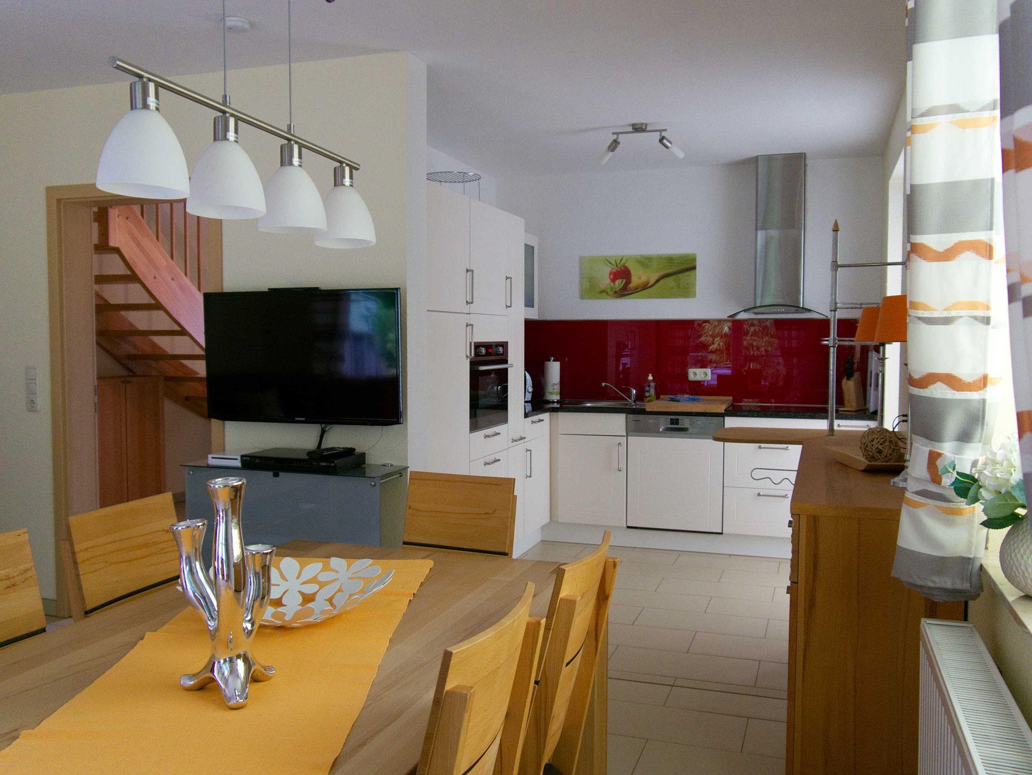 Attraktives ganzjährig nutzbares Ferienhaus in ruhiger aber zentraler Lage. Gehobene Ausstattung mit Massivholzmöbeln in mediterranen Farbtönen. Im EG erwartet Sie ein HWR mit kostenfreier Waschmaschine und Wäscheständer, Bügelbrett und Bügeleisen, ein Duschbad mit Sauna, ein gemütliches Wohnzimmer mit Kamin, Ledercouch, Essecke, WLAN-Anschluss, Flachbildschirm, SAT-TV/Radio, CD/DVD-Player, offener Küche mit Geschirrspüler, Backofen/Mikrowelle, Induktionskochfeld, Kühlschrank mit einem Gefrierfach, Wasserkocher, Kaffeefiltermaschine, Toaster und ausreichend Geschirr.