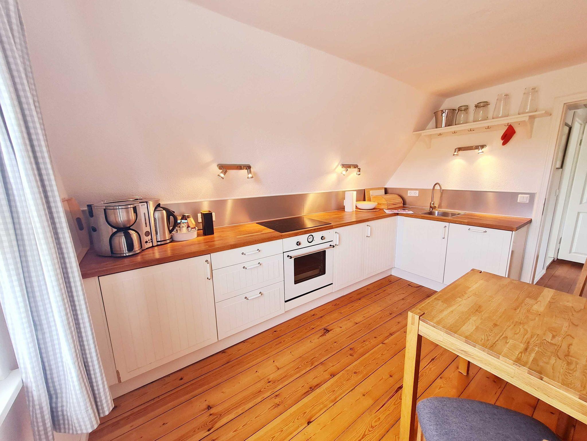 • Küche: komplette Einbauküche mit Ceranfeld, Backofen, Geschirrspülmaschine, Toaster, Kaffeemaschine, Wasserkocher, Kühlschrank mit Gefrierfach, Tisch mit 2 Stühlen