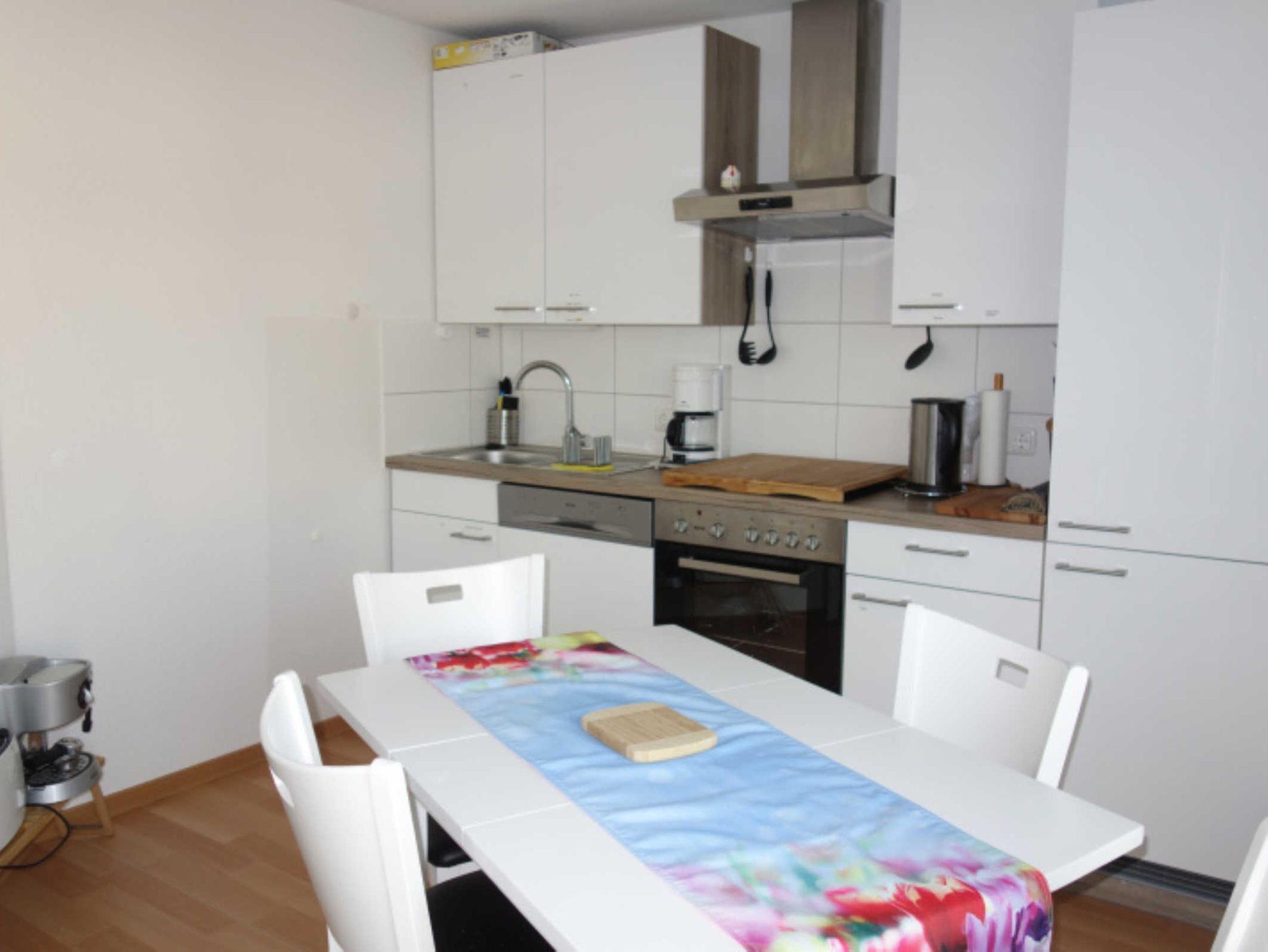 Die Küche mit einem Esstisch und vier dazu passenden Stühlen verfügt unter anderem über einen Backofen, 4 Ceranfelder, einen Geschirrspüler, einen Kühlschrank mit Gefrierfach, eine Kaffeemaschine und einen Wasserkocher.