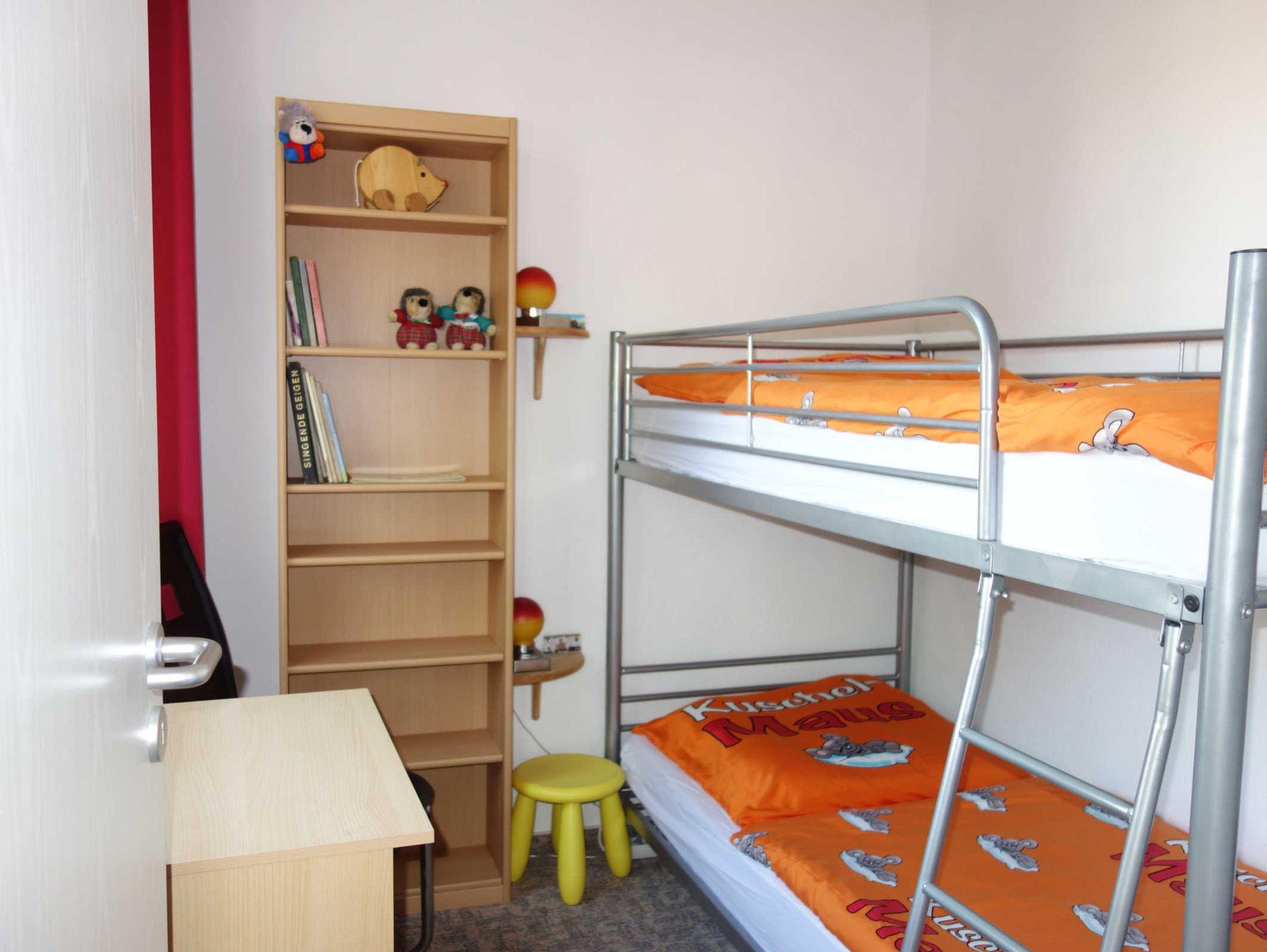 Das kleinere Schlafzimmer hat ein Etagenbett, einen kleinen Schreibtisch und ein Regal.