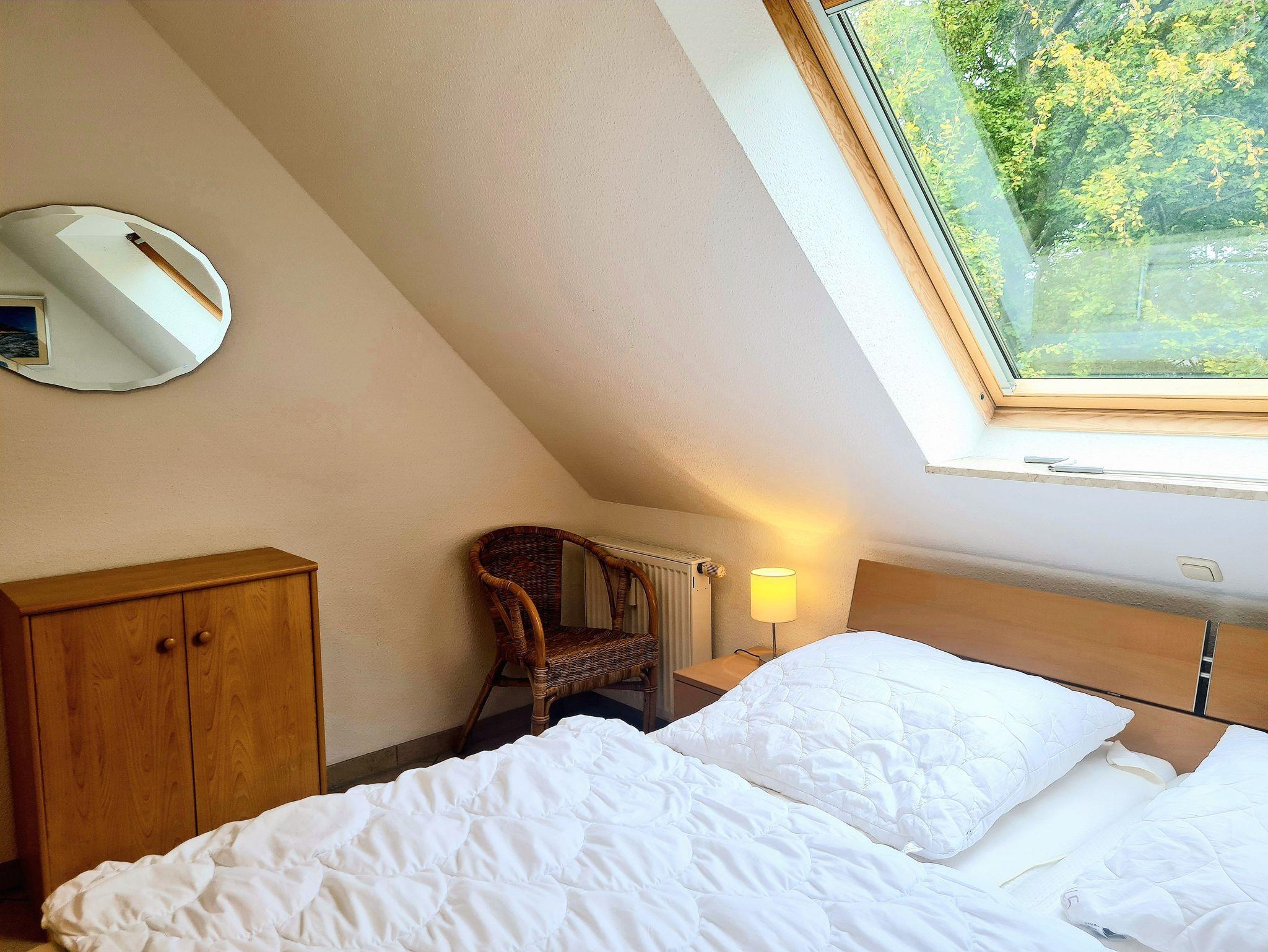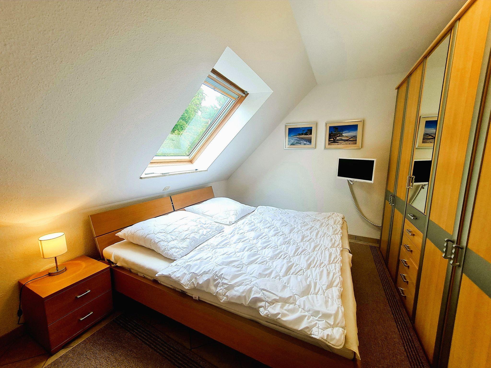 • Schlafzimmer: Doppelbett mit zwei Einzelmatratzen 90x200 m, Kleiderschrank, Kommode, Spiegel, Sessel, Nachttische mit Lampen, TV, Tageslichtrollo am Dachflächenfenster
