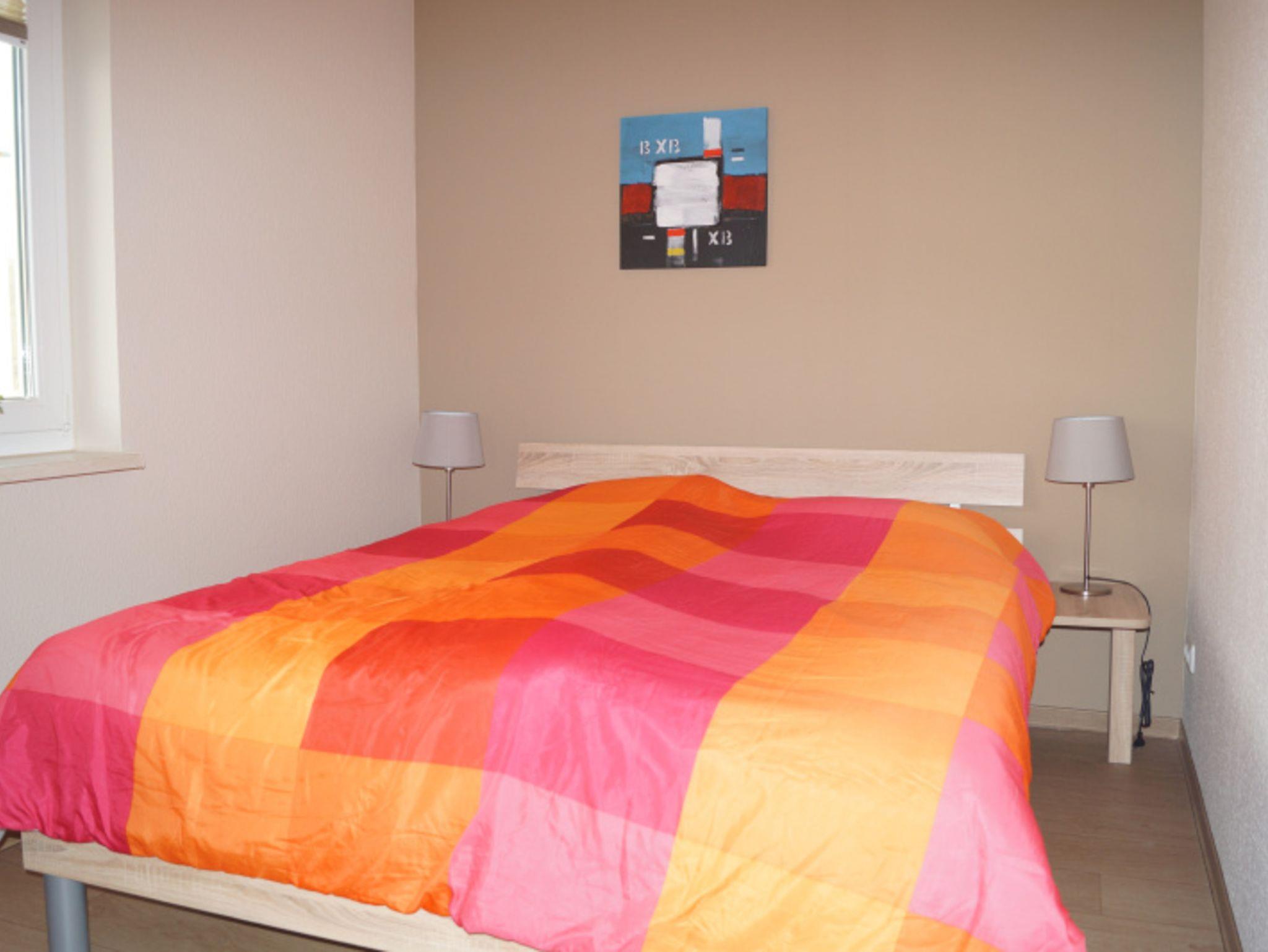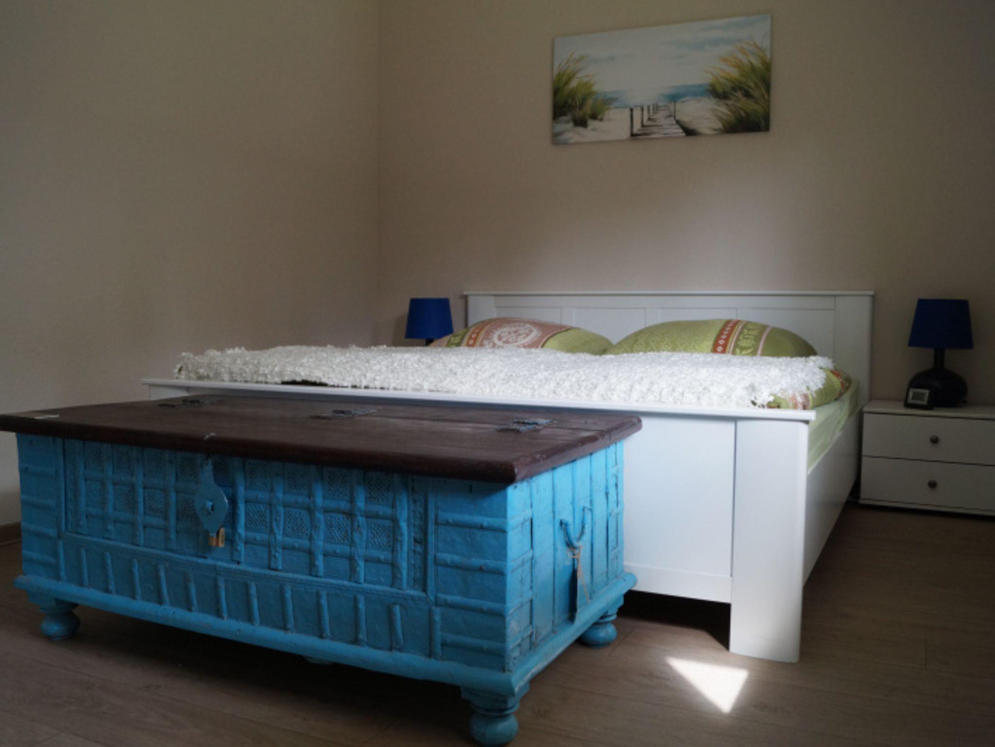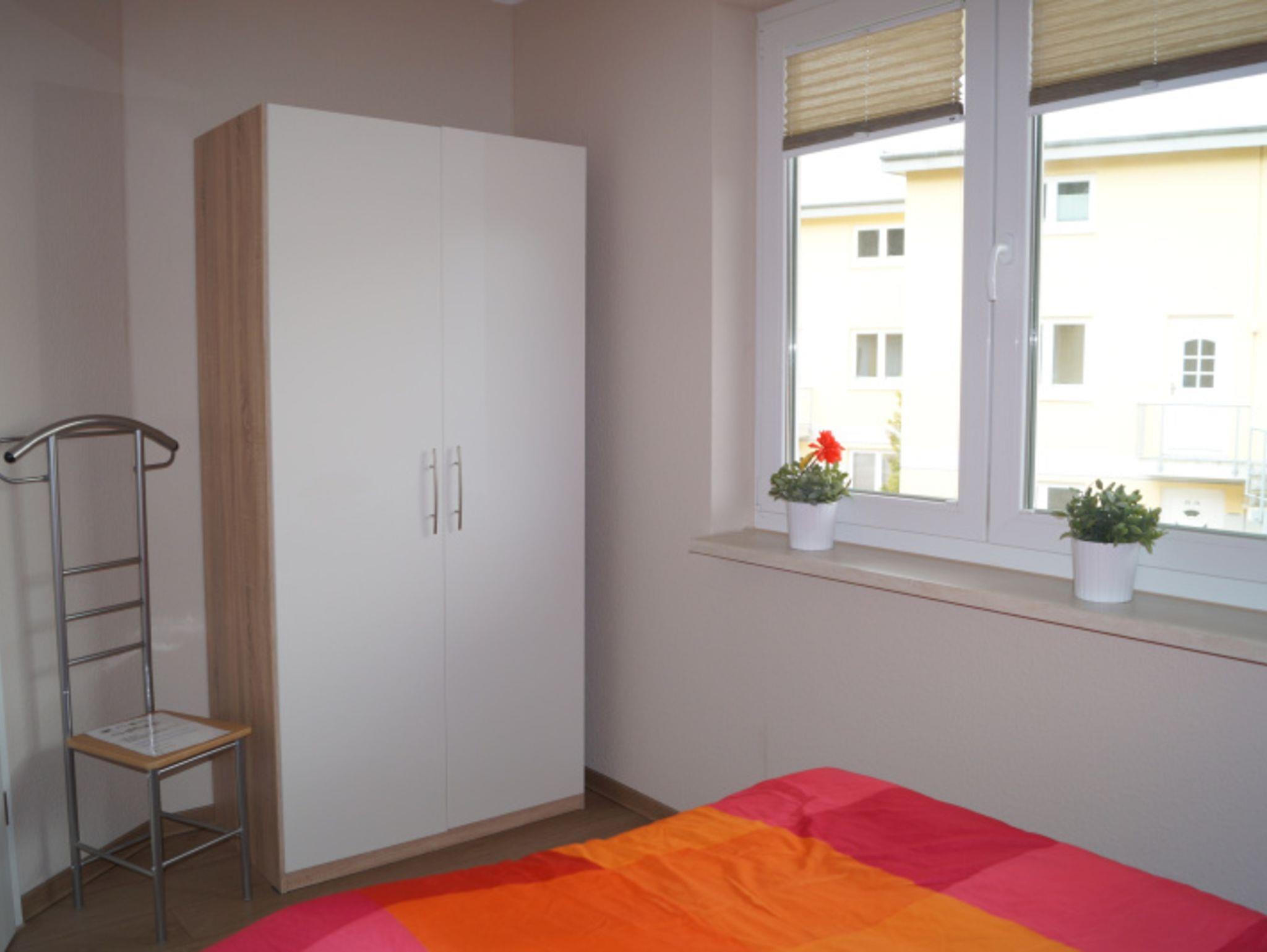 Das Schlafzimmer verfügt über ein Doppelbett und einen Kleiderschrank. In einem weiteren Zimmer stehen ein weiteres Doppelbett und ein weiterer Kleiderschrank.