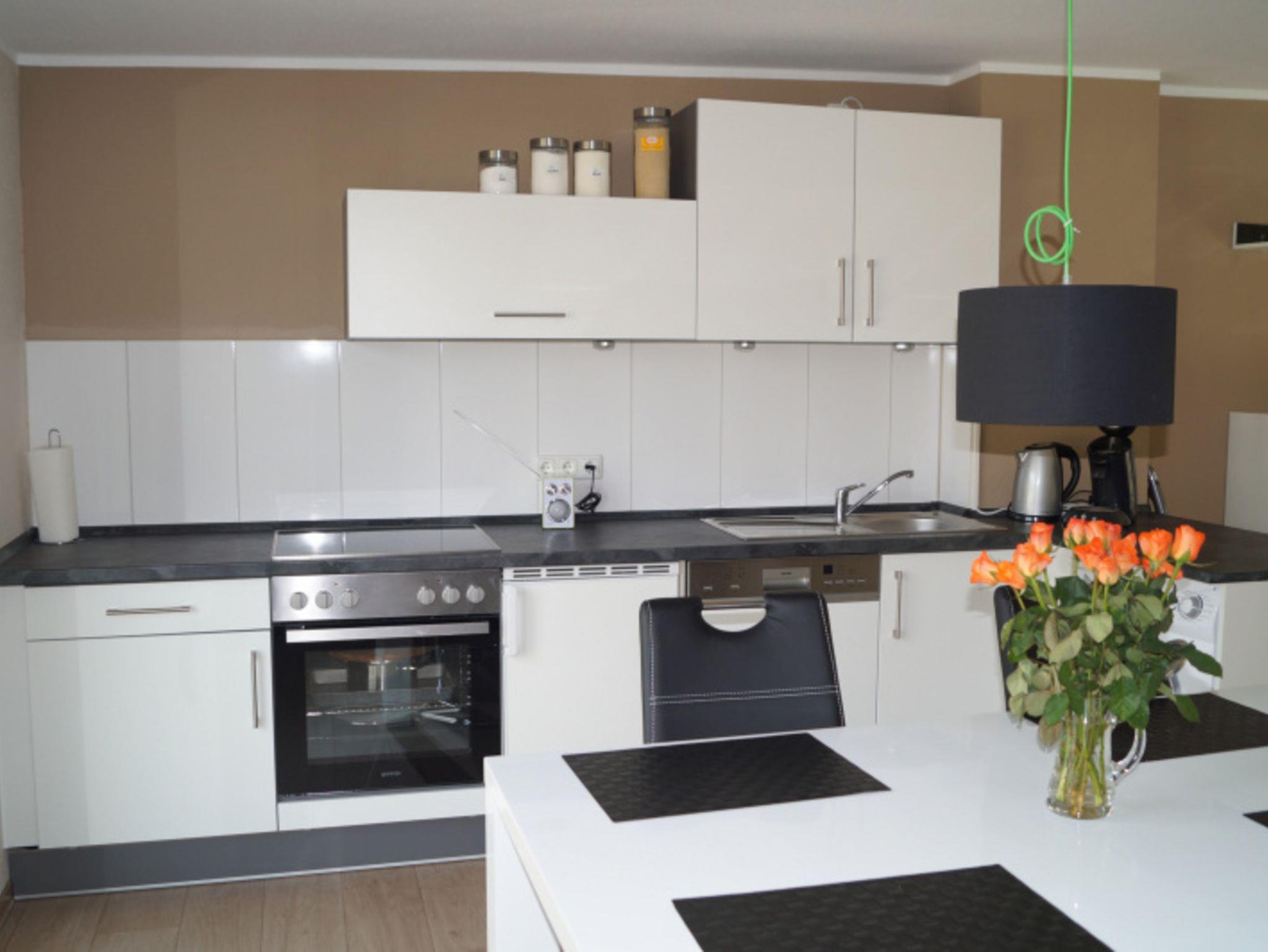 Die offene Küche mit großem Esstisch und sechs Stühlen ist in das Wohnzimmer integriert und verfügt unter anderem über einen Backofen, 4 Ceranfelder, einen Geschirrspüler, einen Kühlschrank, eine Brotschneidemascine, einen Eierkocher, ein Waffeleisen, eine Kaffeemaschine und einen Wasserkocher.