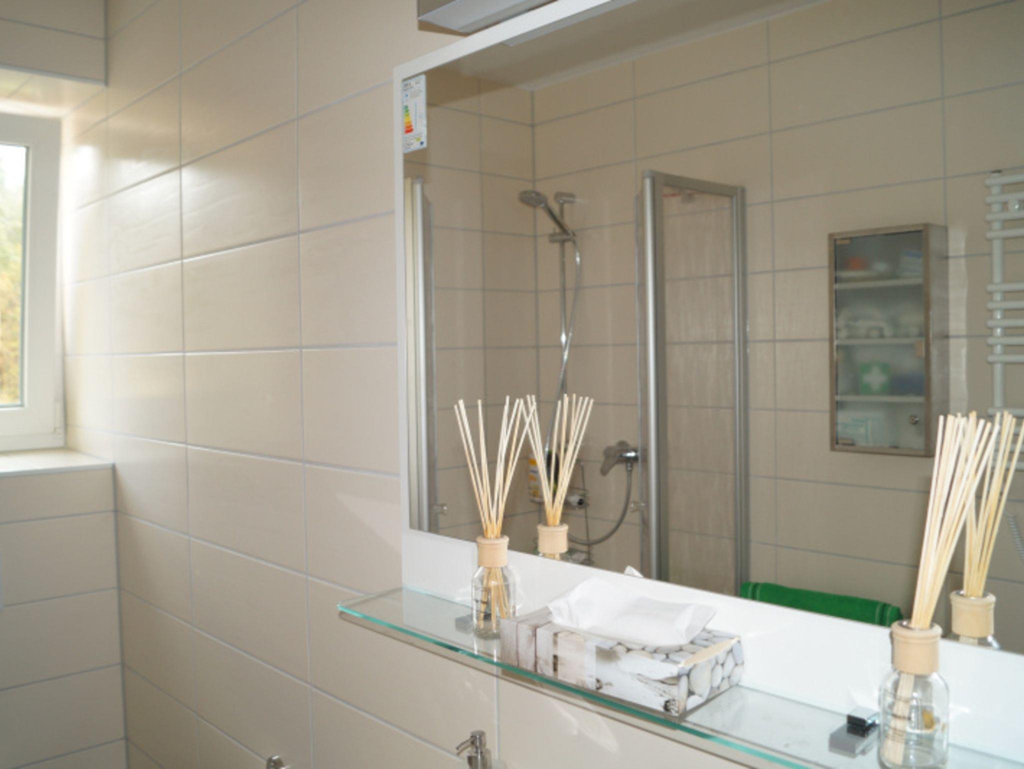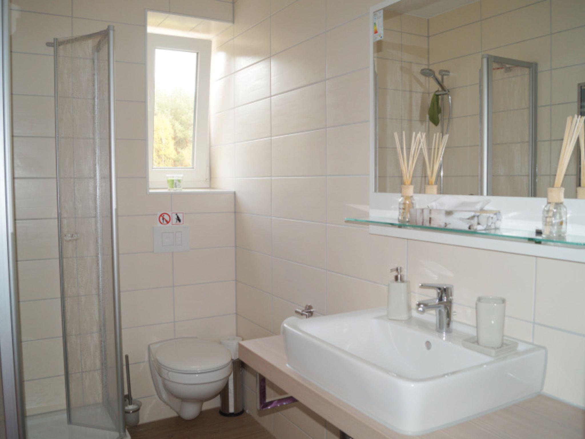 Im gefliesten Bad mit Fenster befinden sich die Dusche und das WC.