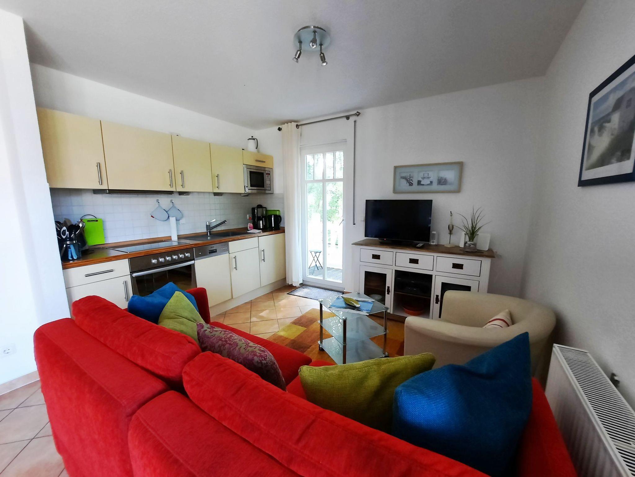 Die Ferienwohnung verfügt über ein Wohnzimmer mit integrierter Küchenzeile, ein Schlafzimmer, ein Bad, 2 Balkone, einen kleinen Flur, einen PKW-Stellplatz und einen Fahhradschuppen.