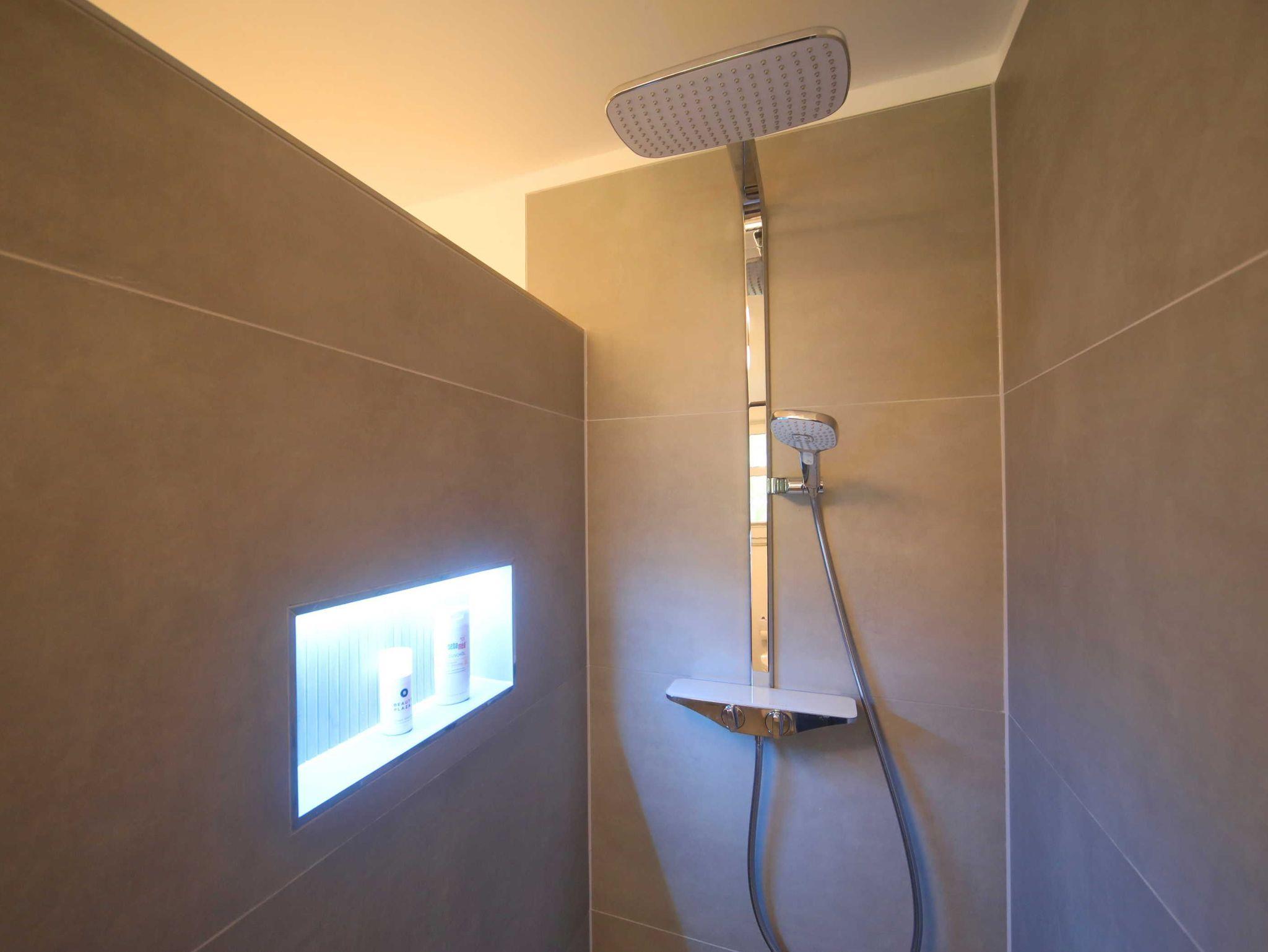 • Bad: Begehbare Dusche, Doppelwaschtisch, Toilette, Spiegel, Schränke, Fußbodenheizung und Handtuchheizkörper, Fön, Waschmaschine und Wäscheständer