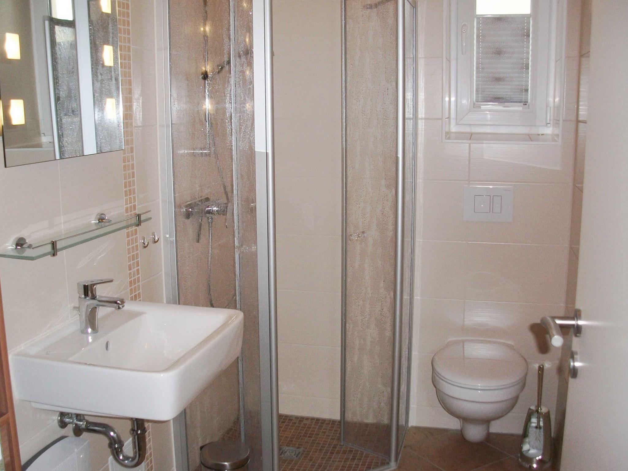Das Bad mit Fenster hat eine Dusche und ein WC.