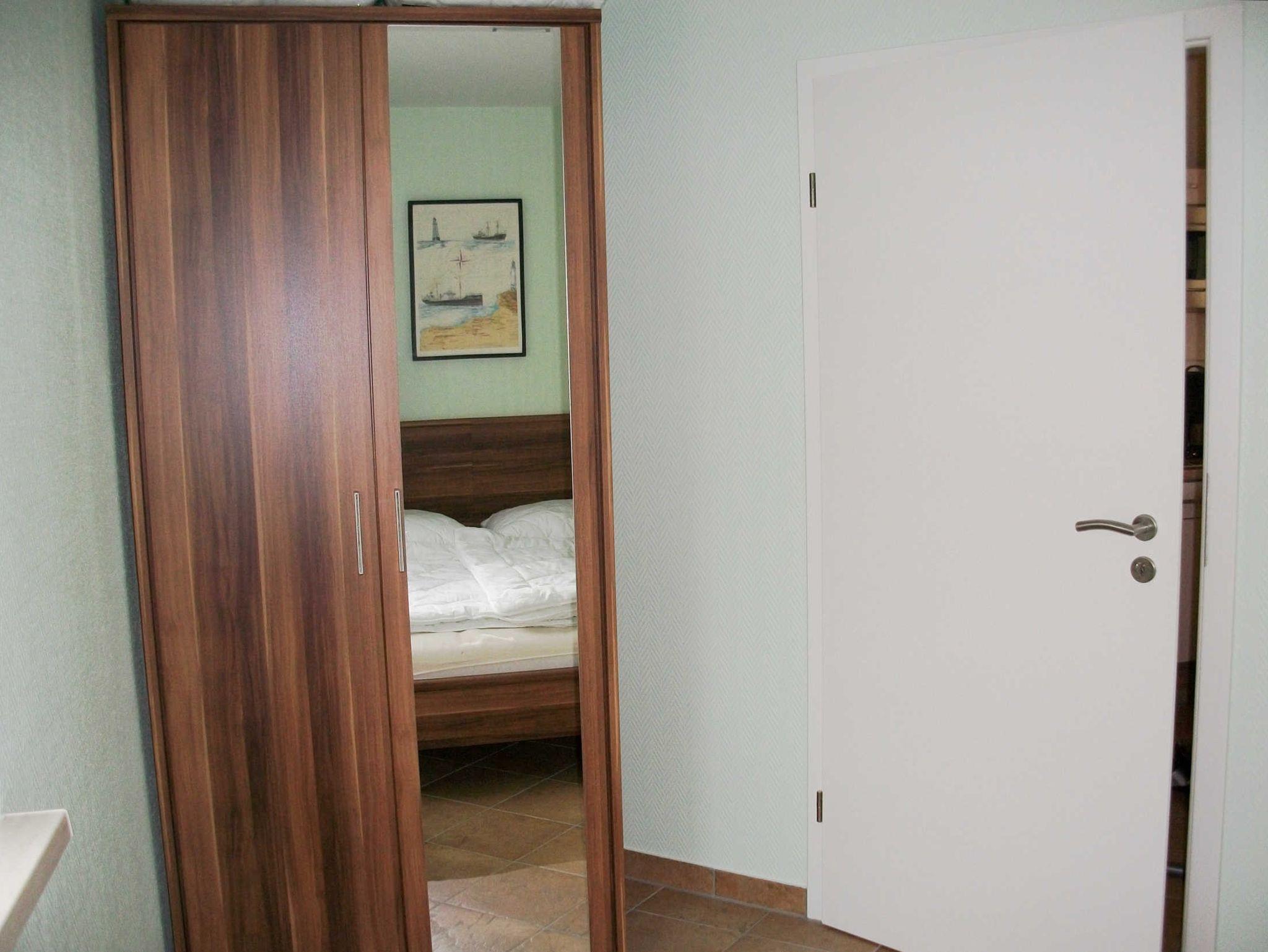 Im Schlafzimmer befinden sich ein Doppelbett und ein Kleiderschrank.