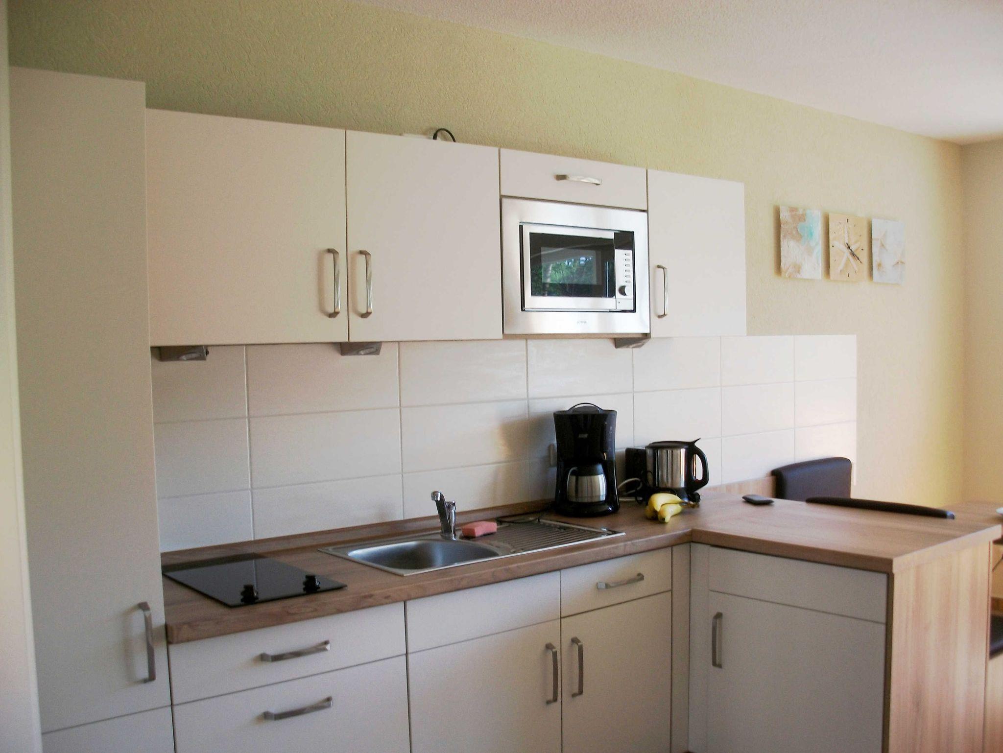 Die in das Wohnzimmer integrierte Küchenzeile ist u.a. mit einem Kühlschrank mit Gefrierfach, einem Ceranfeld mit 2 Kochfeldern, einer Mikrowelle, einem Wasserkocher und einer Kaffeemaschine sowie einem Esstisch, einer Essbank und 2 Stühlen ausgestattet.