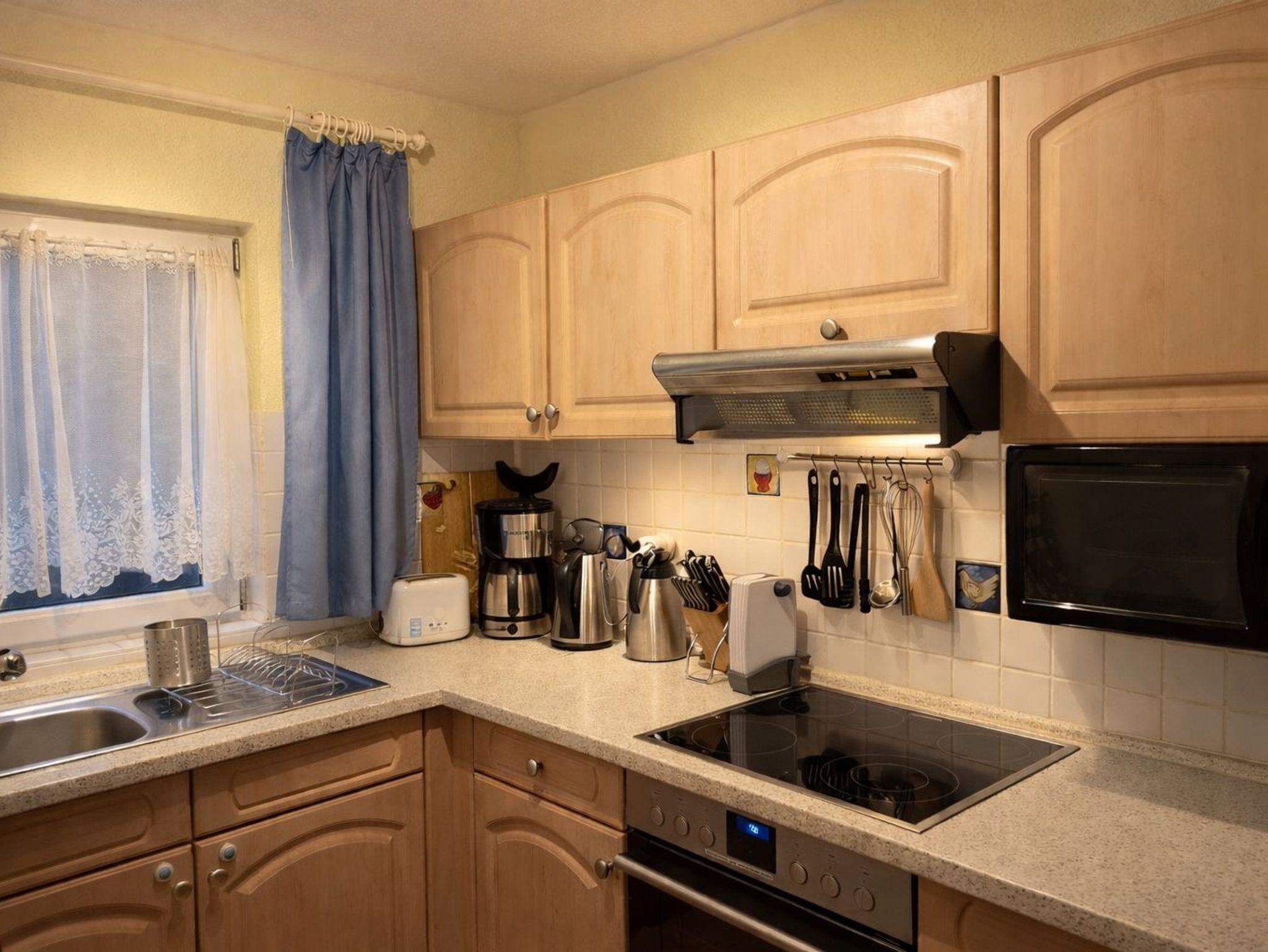 • Vollausstattung: Eine moderne Einbauküche, Flachbild-TV, Radio und ein Gasofen für behagliche Wärme an kühleren Abenden.