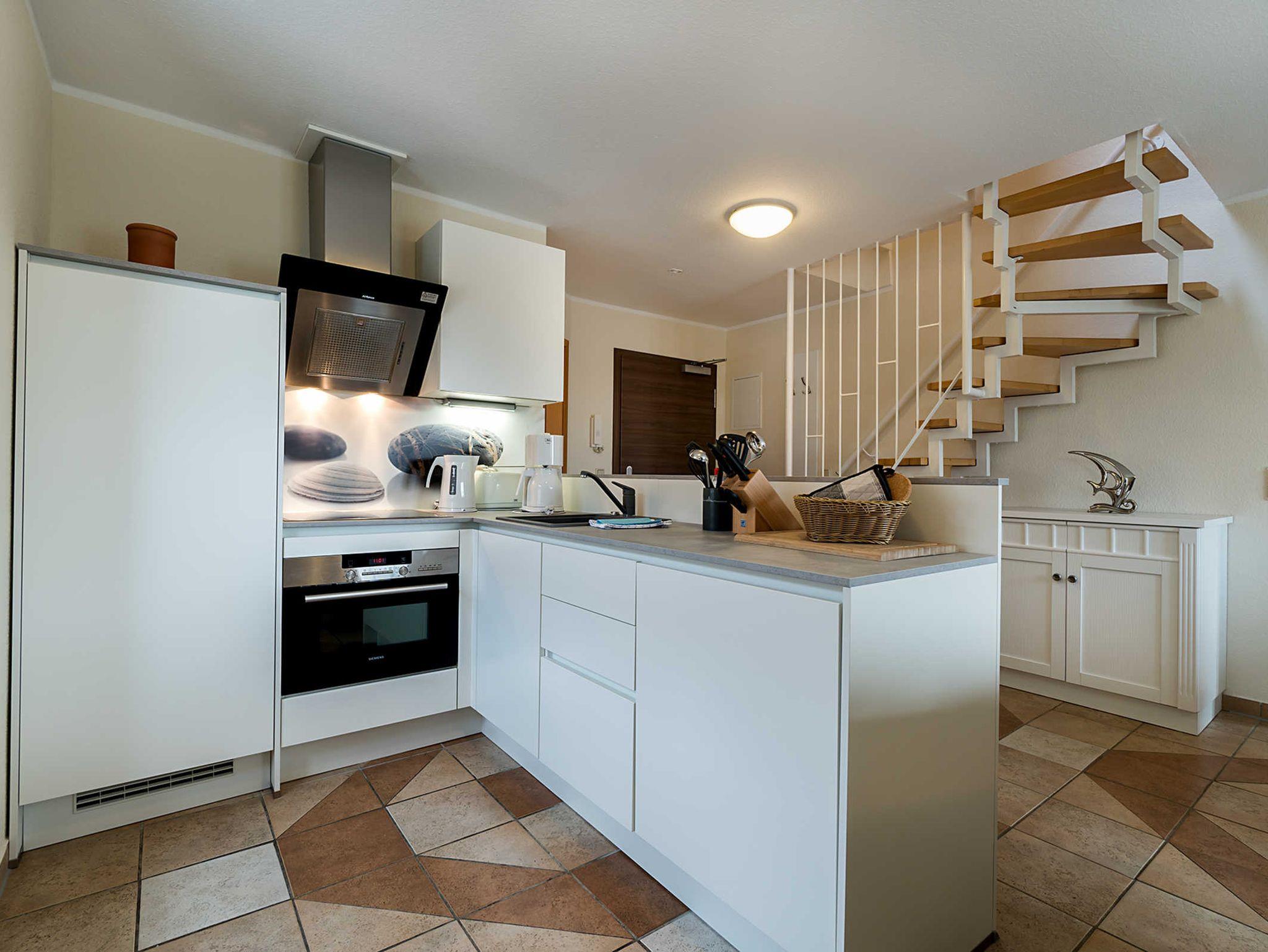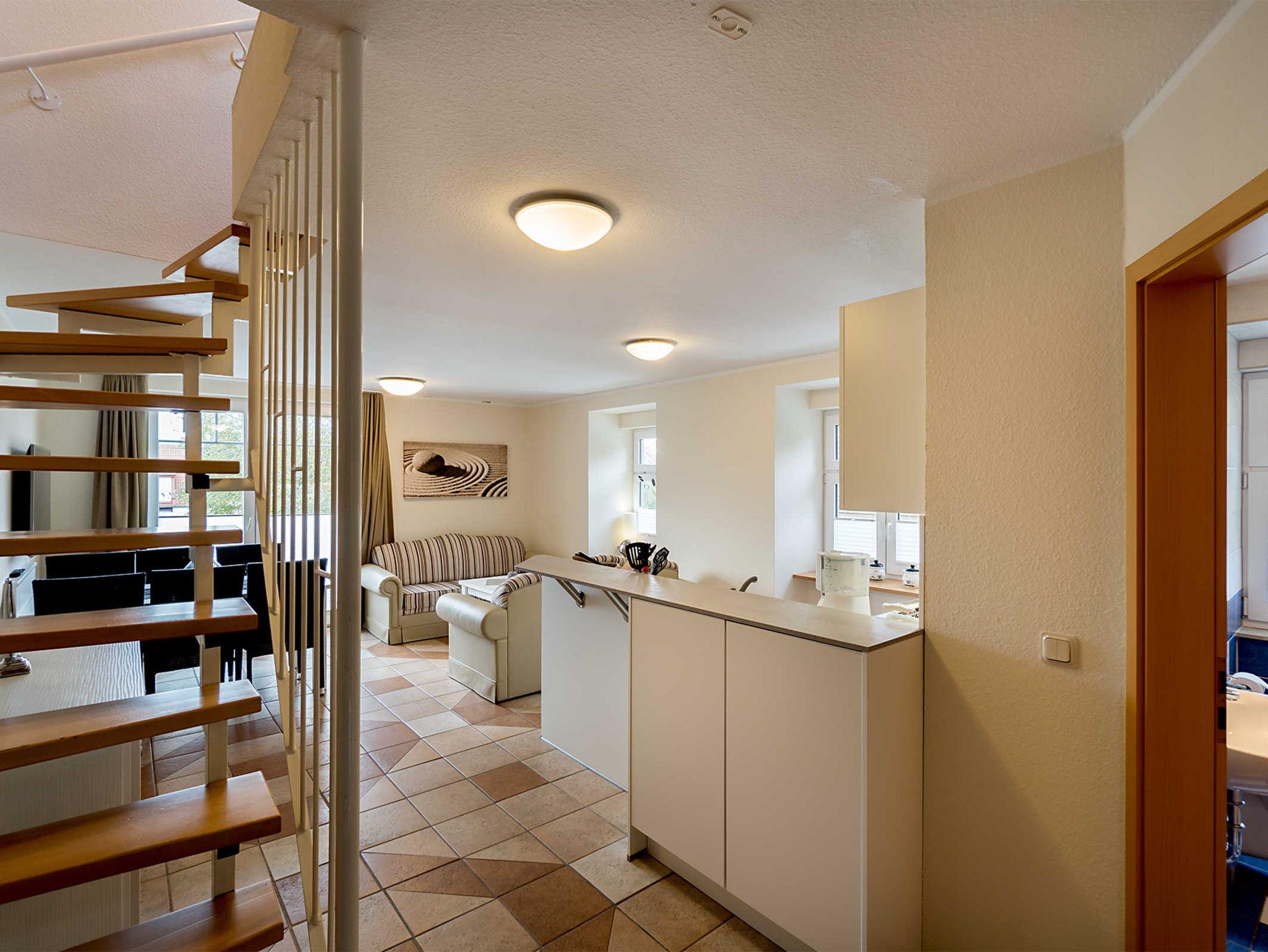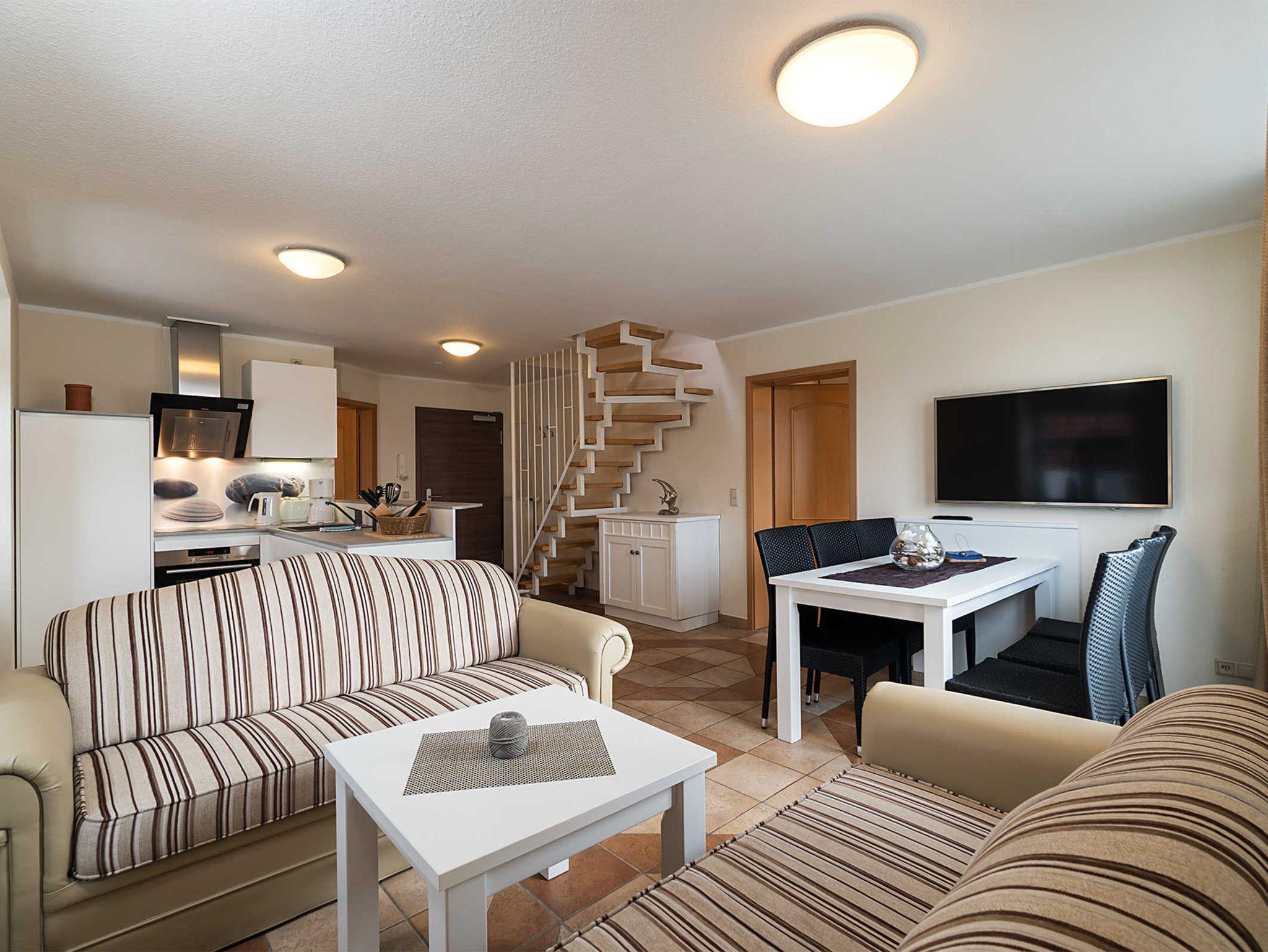 Diese Ferienwohnung bietet 85 m² Urlaub auf 2 Etagen. Neben einem Wohnbereich mit Küche und Balkon, finden Sie hier 3 Schlafzimmer, zwei mit Doppelbett und eines mit zwei Einzelbetten. Zudem verfügt diese Ferienwohnung über zwei Bäder. Eines der Bäder ist mit einer Dusche ausgestattet und das andere mit einer Badewanne.