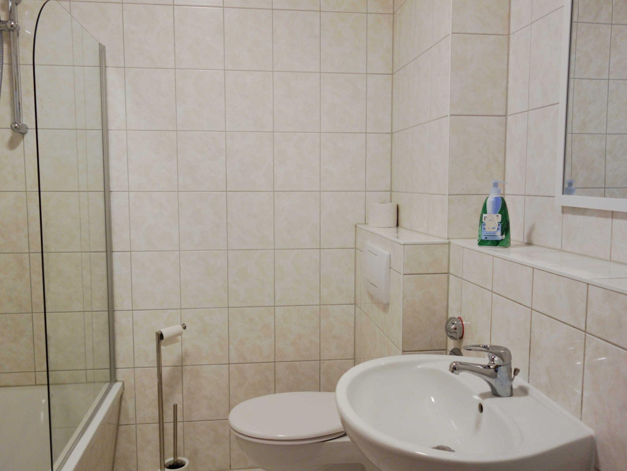 Das geflieste Bad hat eine Badewanne, einen Waschtisch und ein WC.