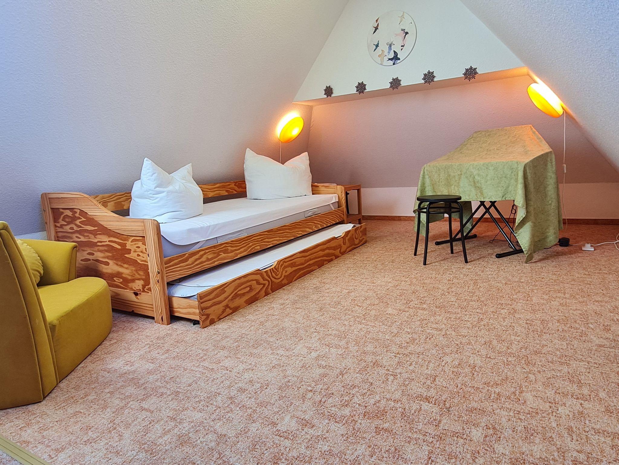 • Galerie: Ausziehbett je 90x200 cm, Sessel, Keyboard und Noten, Radio mit CD, Tisch und 2 Stühle, Verdunklungsrollos, Bluetooth Lautsprecher (Anker)