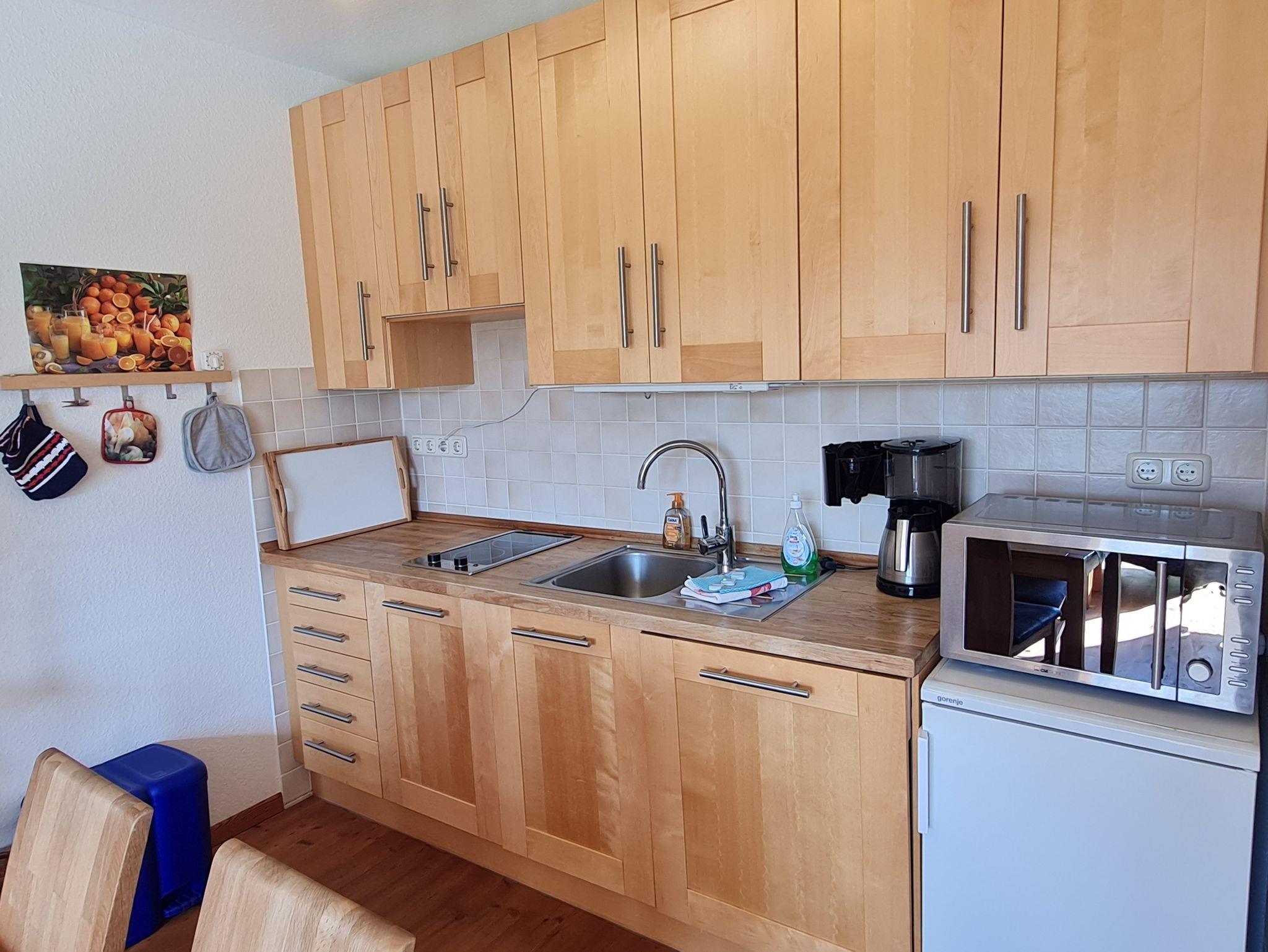 • Küche mit Essbereich für 4 Personen offen zum Wohnzimmer, mit komplett eingerichteter Einbauküche wie, Kombi-Mikrowelle/Backofen, 2 Kochfelder, Kühlschrank mit Gefrierfach, Wasserkocher, Toaster, Kaffeemaschine, Geschirrspüler