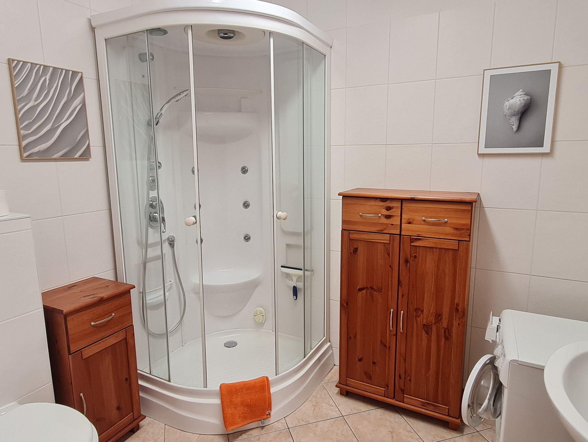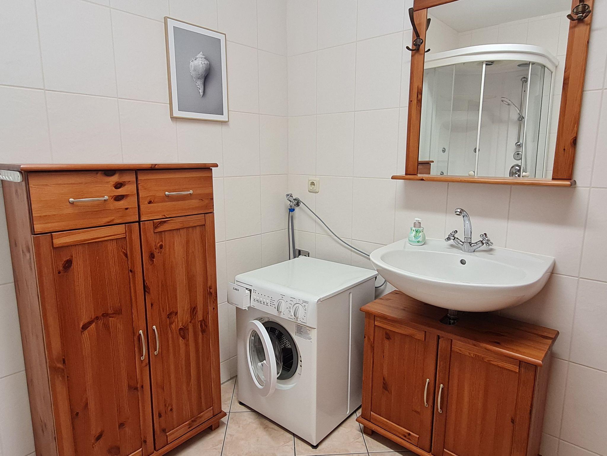 • Bad: ohne Fenster, Dusche (auch als Dampfsauna nutzbar) Waschbecken, Toilette, Spiegel, Schränke, Fön, Hocker, Waschmaschine