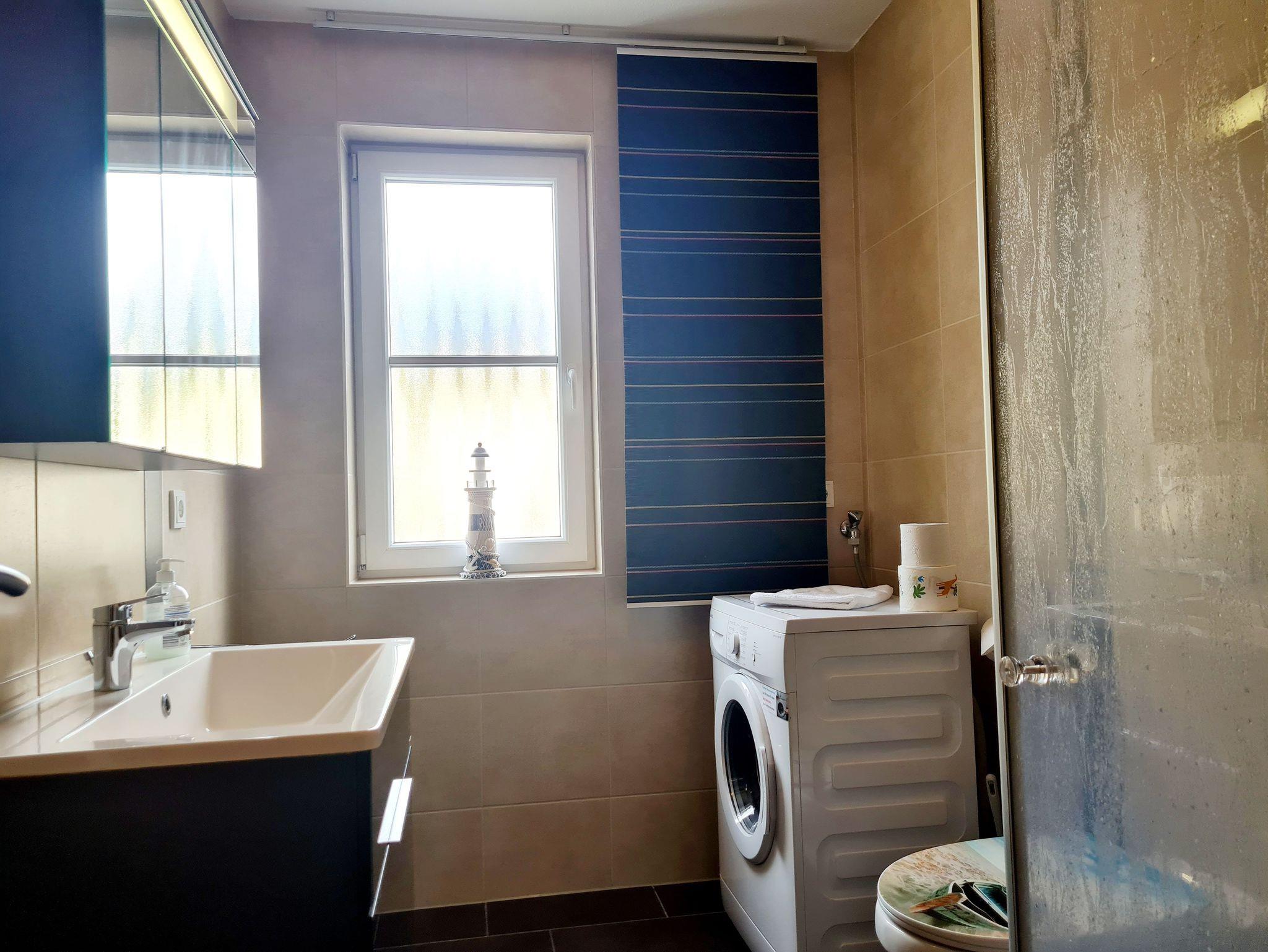 • Bad: mit Fenster, Dusche, Waschbecken, Toilette, Spiegelschrank, Unterschrank Waschbecken, Waschmaschine (Frontlader)