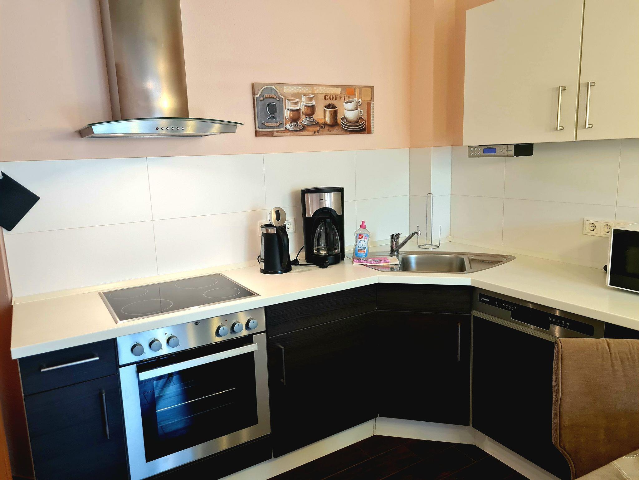 • Küche und Essbereich für 4 Personen offen zum Wohnzimmer, komplett eingerichtete Einbauküche mit Cerankochfeld, Backofen, Geschirrspüler, Mikrowelle, Kühlschrank, Wasserkocher, Toaster, Kaffeemaschine