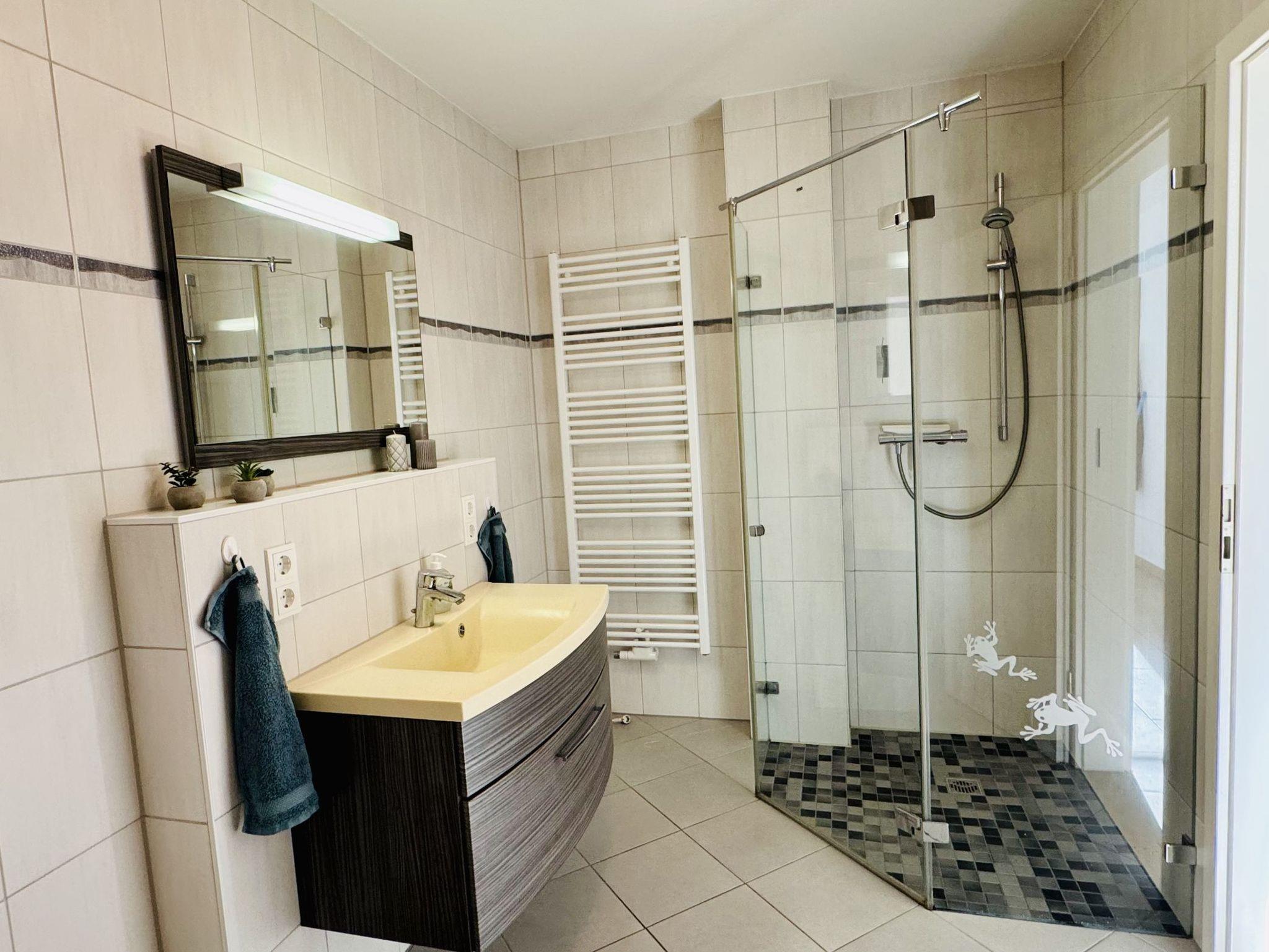 Das Bad hat eine große ebenerdige Echtglas-Dusche, ein WC, eine Waschmaschine sowie einen Fön.